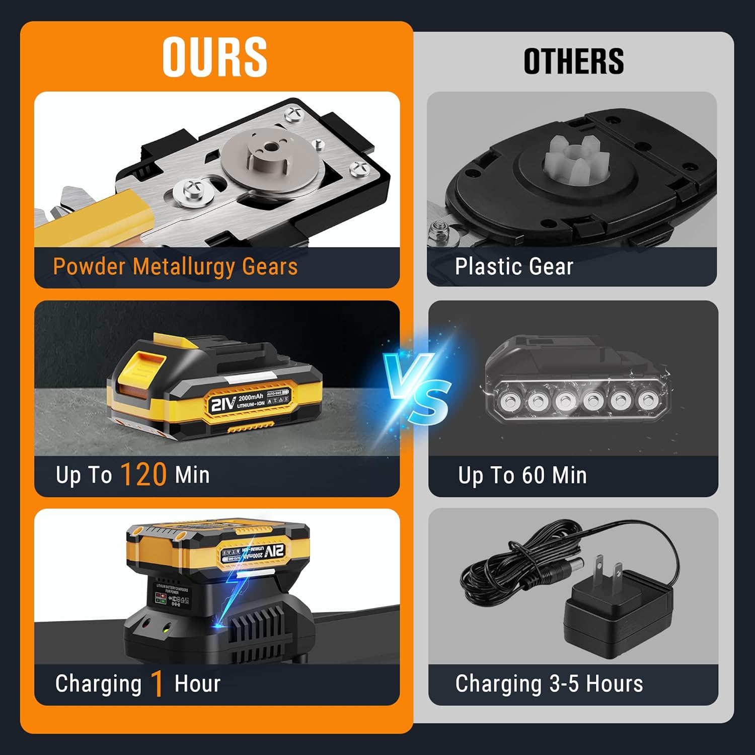 - ✅ UL-Listed fast charger & High-performance 2000mAh lithium battery, 60-minute fast charger-enjoy 60+ mins continuous runtime. Battery has a built-in intelligent protection system. Compatible with EWORK 21V series (Leaf Blower/String Trimmers). 500+ cycle battery lifespan tested. Battery Management System (BMS) actively guards against overcharging/overheating/short circuits while maintaining 80% capacity after 800 cycles