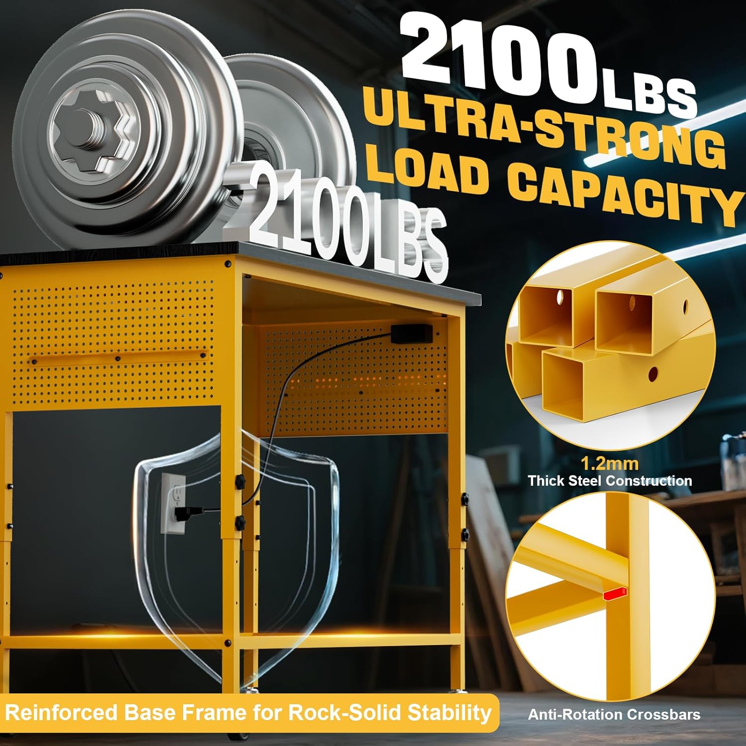 - Ultra-Stable 2100LB Heavy Duty Workbench with Reinforced Frame: This professional garage workbench features a patented bottom crossbar design that eliminates wobbling - unlike competing work tables that shake under load. The industrial-grade steel frame and MDF top deliver unmatched 2100lb capacity, making it ideal for workshop table applications requiring rock-solid stability
