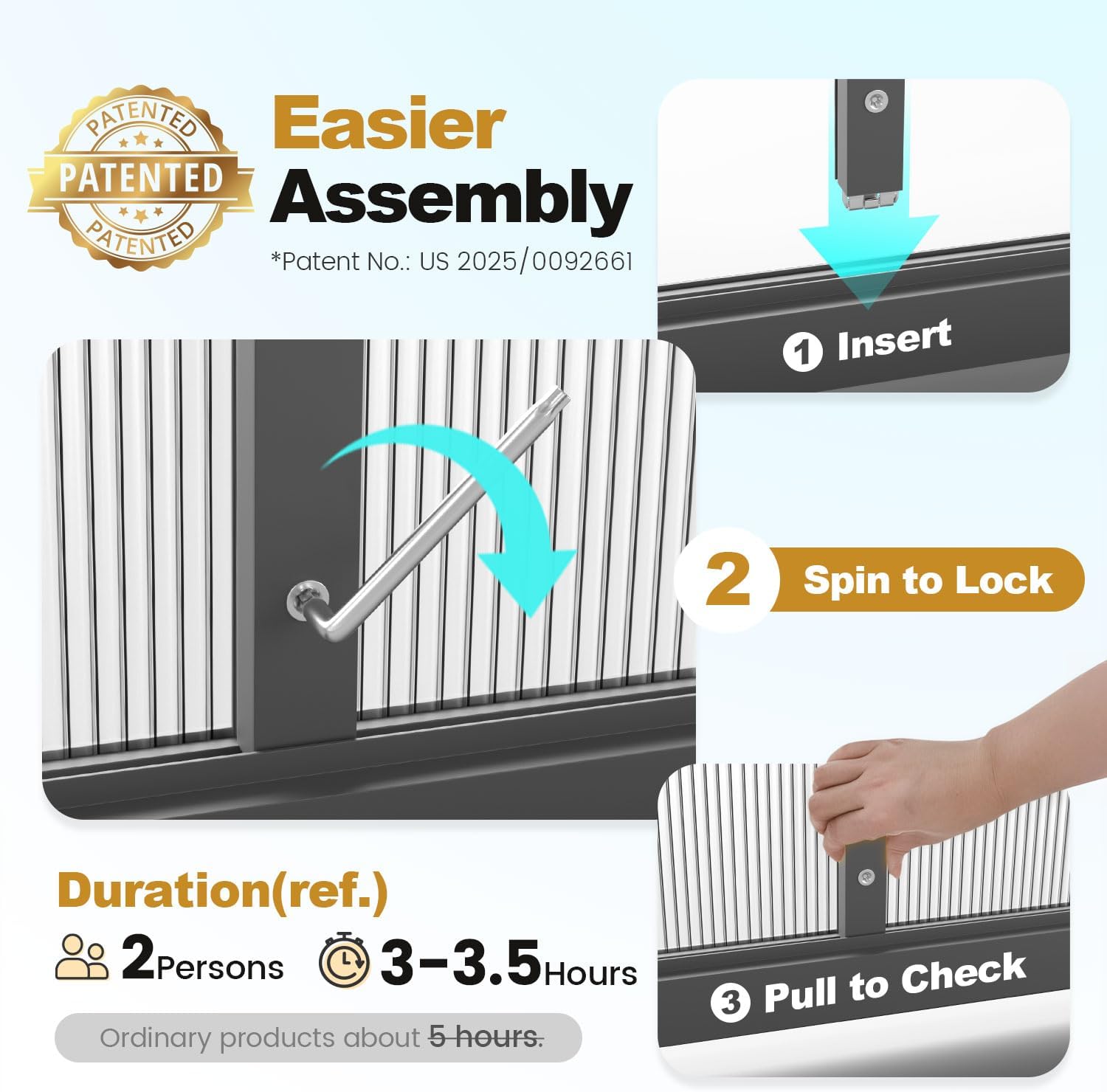 - [Quick-Connect Frame]--This KING BIRD polycarbonate(PC) greenhouse is built with aluminum sturdy frame. The patented(No. US 2025/0092661) Kuick-connect system simplifies the process which reduces 60% installation time, allowing 2-3 people to easy assemble in 2-5 hours (varied with sizes) under our concise and clear instructions/video compared to other unauthorized items.