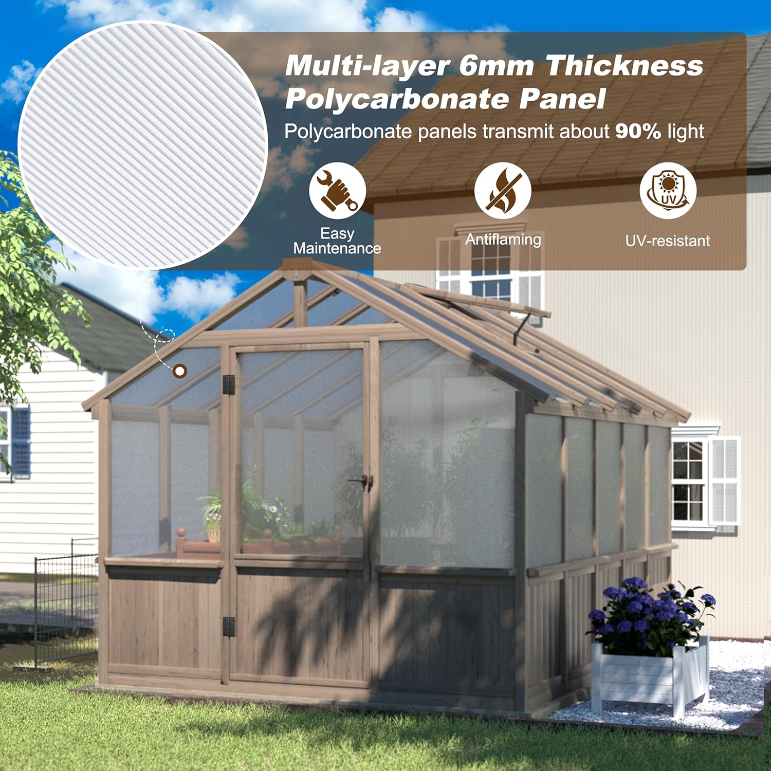 - Premium Cedar Frame - Crafted with a frame made of natural cedar wood, as a stable-performing insulating material, the outdoor greenhouse effectively retains heat, helping to create a warm environment suitable for plant growth. The greenhouse combines durability and versatility, and its natural and simple appearance adds aesthetic appeal to the courtyard, accompanying you on your gardening journey for a long time