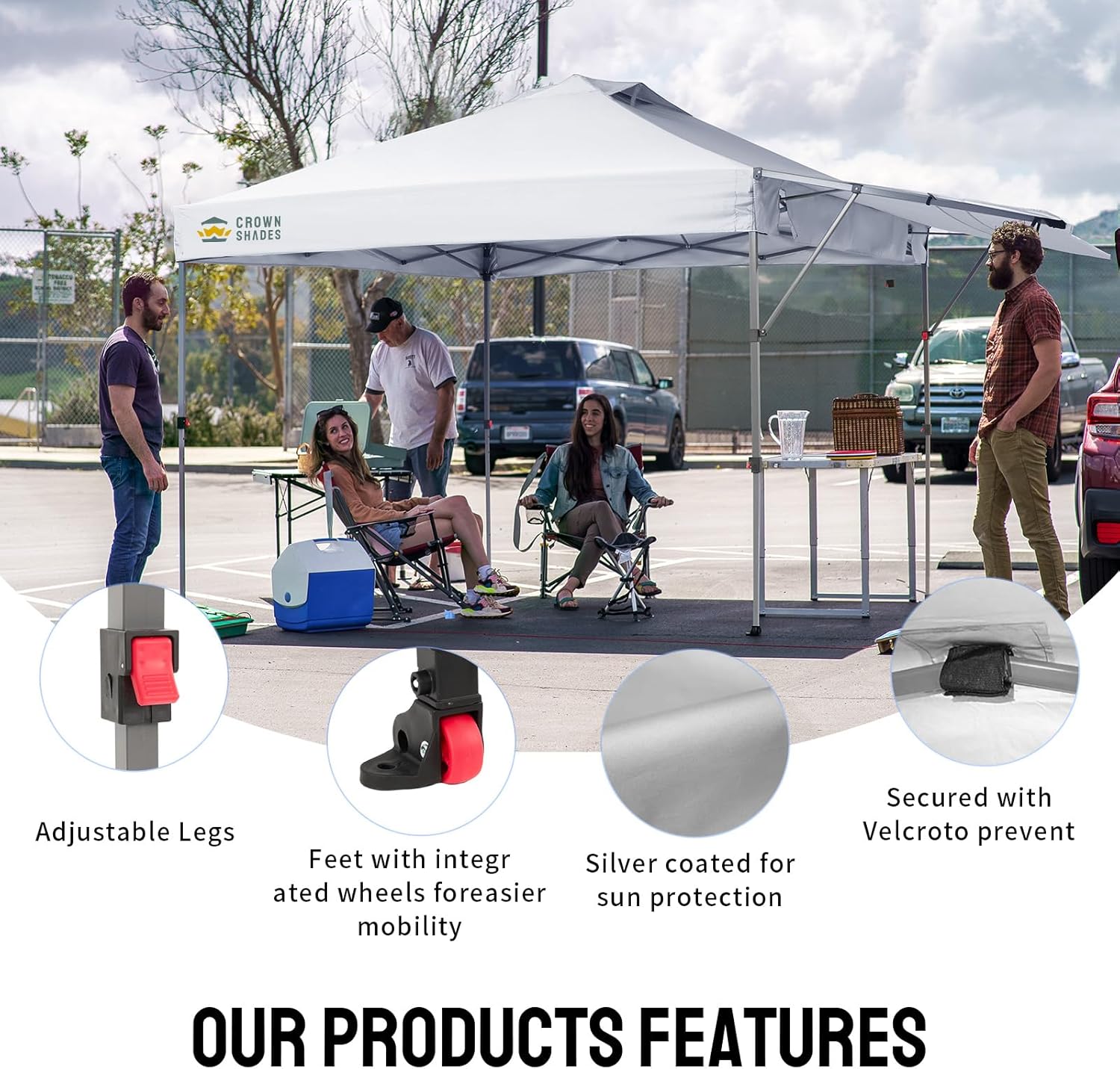 CROWN SHADES 10x10 Pop up Canopy Tent Patended Centerlock Instant Commercial Canopy with 150D Silver Coated Fabric Including 2 Extend Awnings, 4 Ropes, 8 Stakes, 4 Weight Bags (White, 10x14)