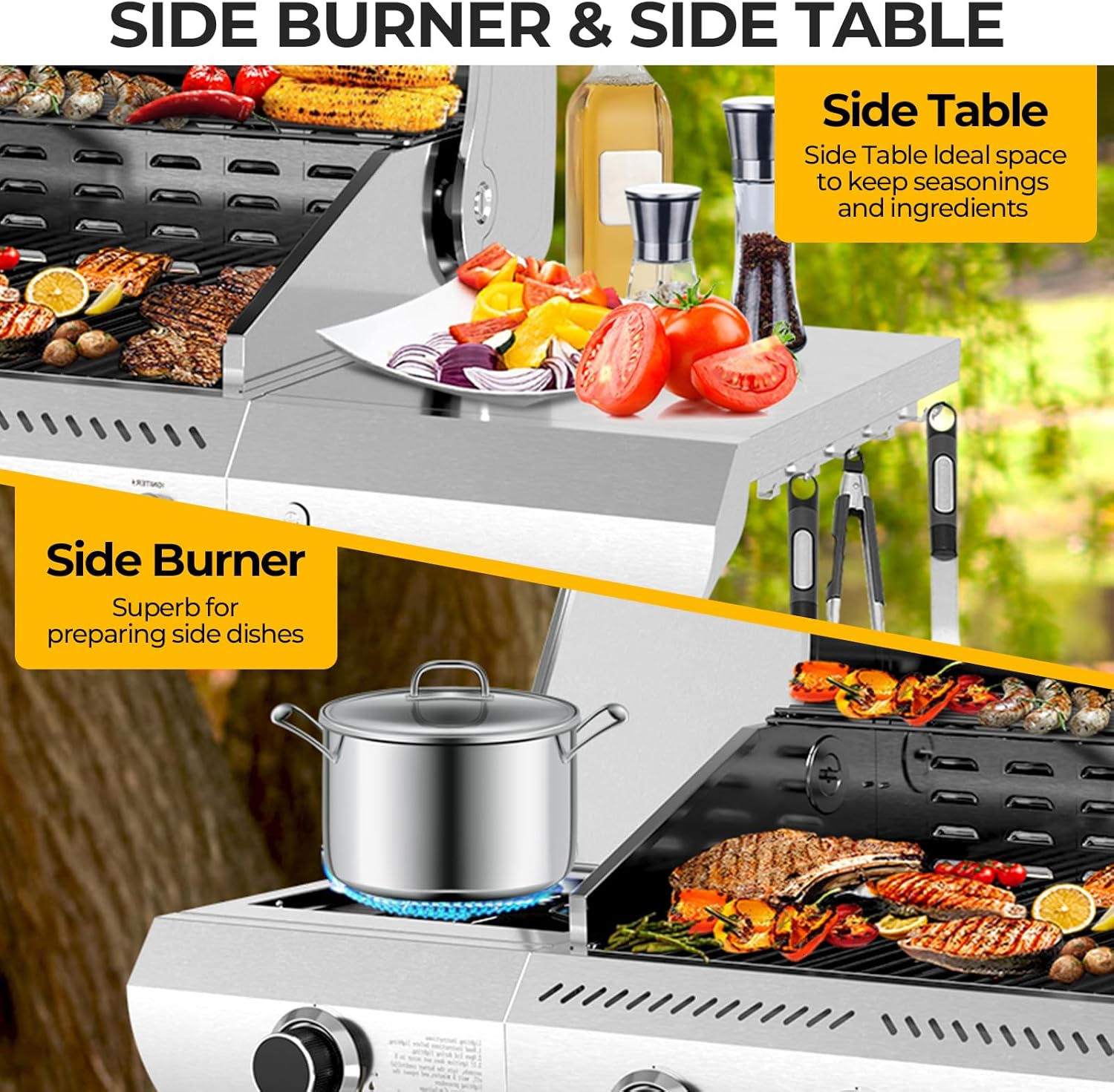 - 3-Burner + Side Burner System : Features three main burners (8,000 BTU each) and a 10,000 BTU side burner for versatile cooking (searing, simmering, or side dishes). Total 34,000 BTU output ensures fast heating and even heat distribution.
