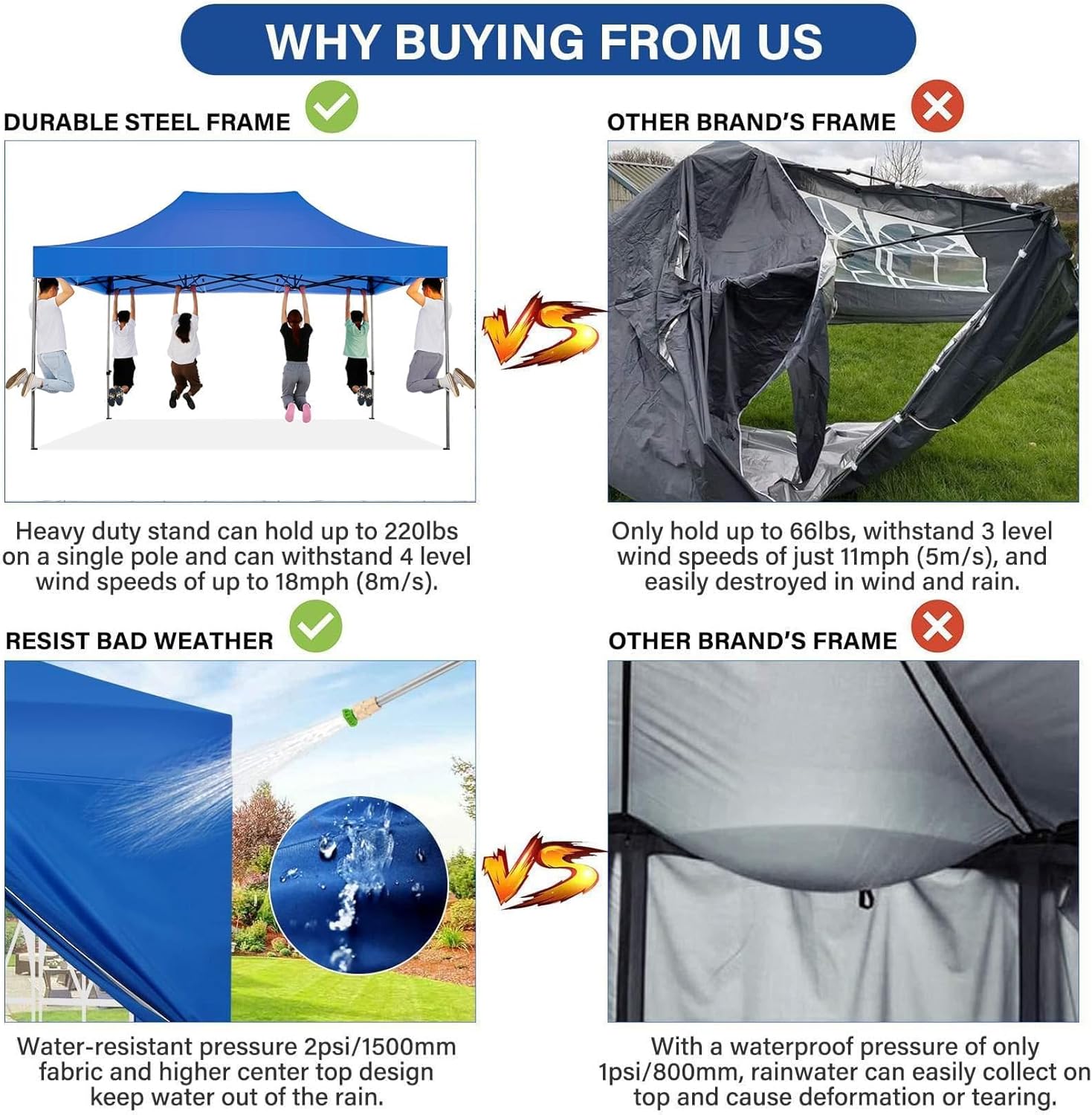 - 【Heavy Duty Alloy Steel Frame】The upgraded 10x15 commercial pop up canopy tent frame can hold up to 220 lbs (100 kg) on a single pole. The frame can hang 6 adults at the same time! Can withstand 4 winds.(<18 mph). 10x15 party tent with an upgraded alloy steel full truss structure, and reinforced plastic parts at the stress points at the intersection of the peaks and poles. 10x15 heavy duty canopy frame with powder coated coating guarantees rust resistance and corrosion resistance.