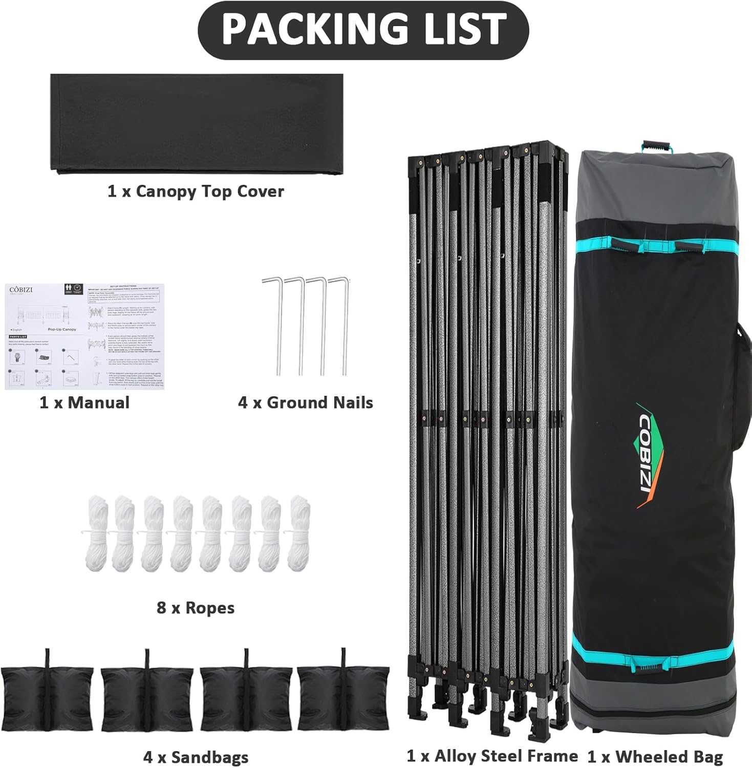 - 【300 SQ Feet Shade Area】COBIZI 10x30 pop up tent provides 300 SQFT spacious covered space, it can easily accommodate 15-20 people, meet your different needs for holding large gatherings. Perfect for wedding, birthday party, market event and other larger events. When in use, always secure the 10x30 pop up tent with the included stakes and ropes to avoid damage. One year after-sale protection for canopy frame; Six months after-sale protection for fabrics and accessories.