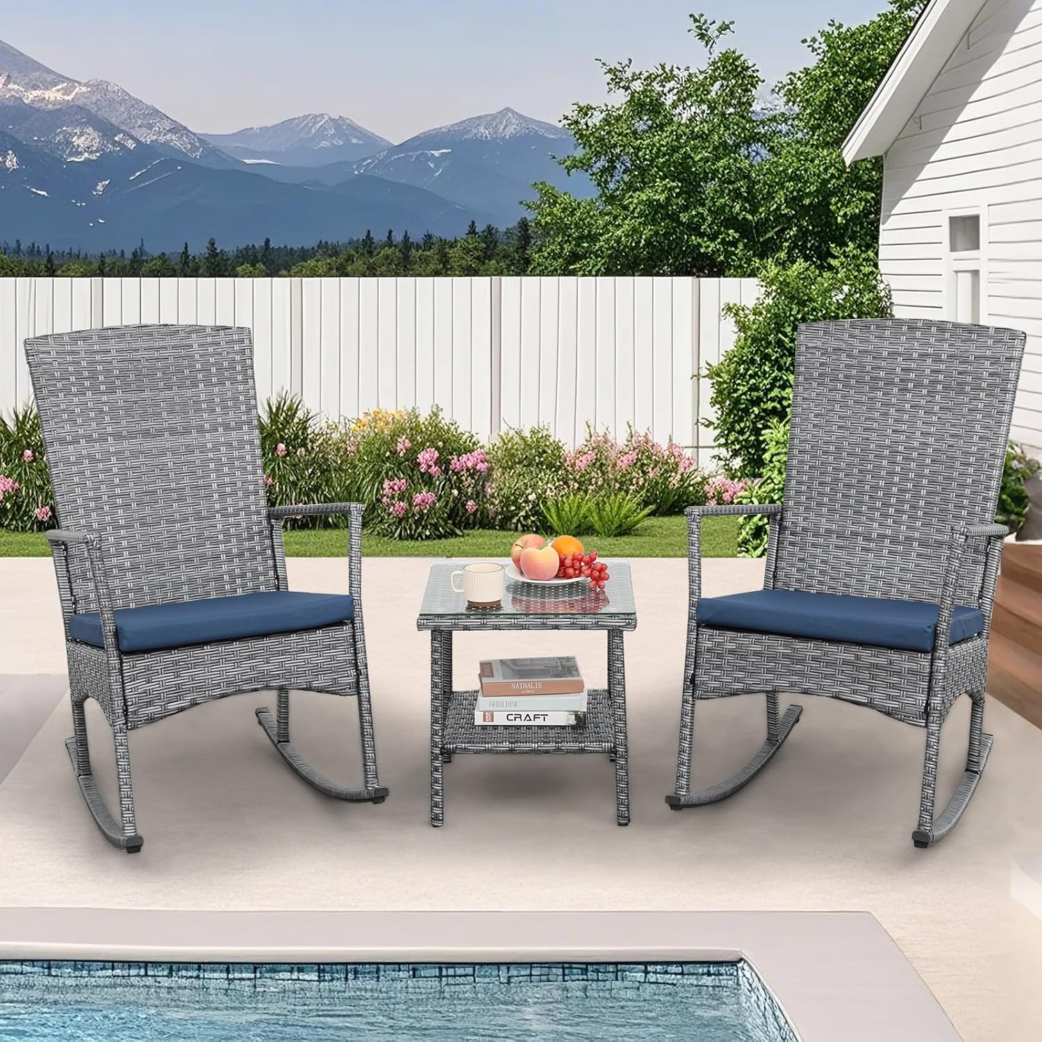 Rocking Chair Outdoor 3 Pieces High-Backed Patio Rocking Chairs Bistro Table and Chairs Set of 2, Navy Blue