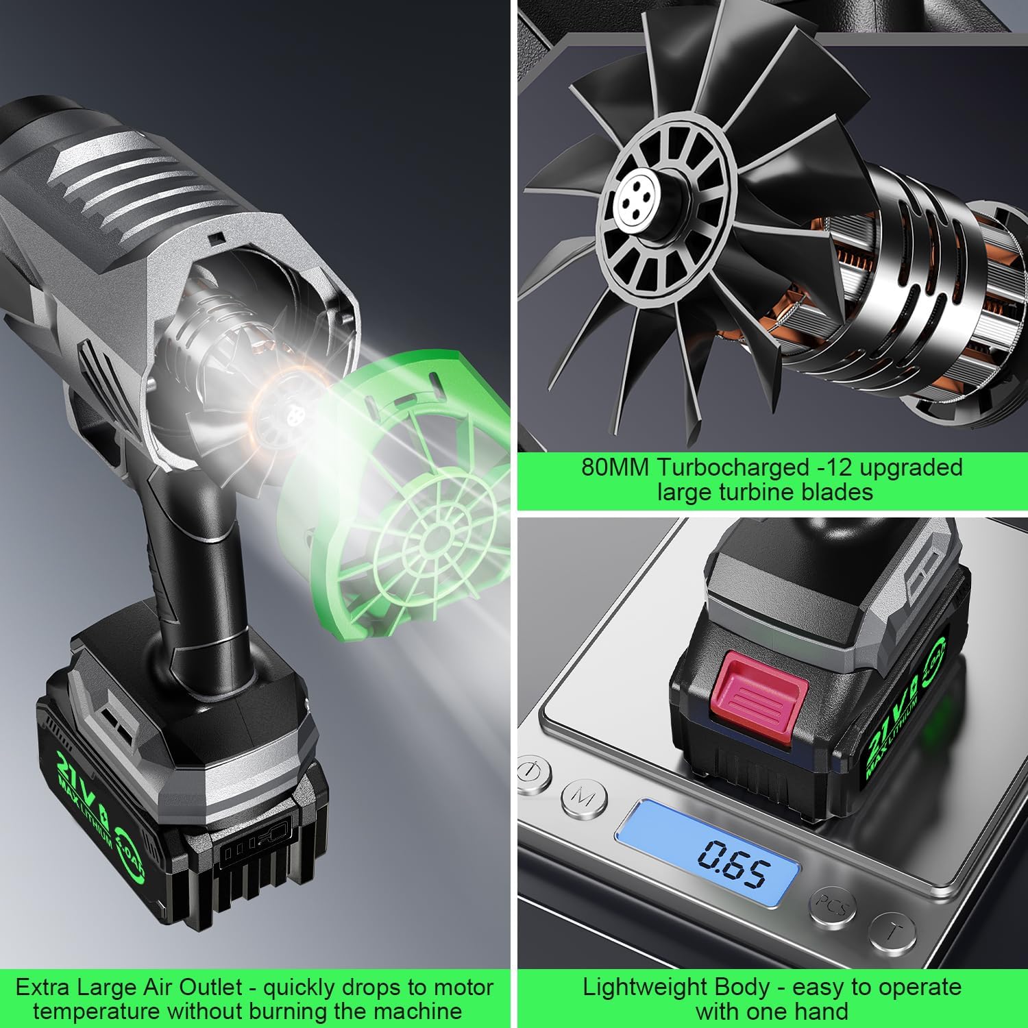 - 【Advanced Powerful Motor】Leaf blower is designed with pure copper battery cells and high-speed brushless turbo motor, strong power, efficient work, stable operation, and long lifespan. Electric leaf blowers comes with a 1 hour fast charger and 2 x 21v 4.0 Ah batteries, which can be used alternately. Leaf blower cordless with battery and charger is also thoughtfully equipped with goggles and earplugs, great tool for quick patio and lawn jobs!