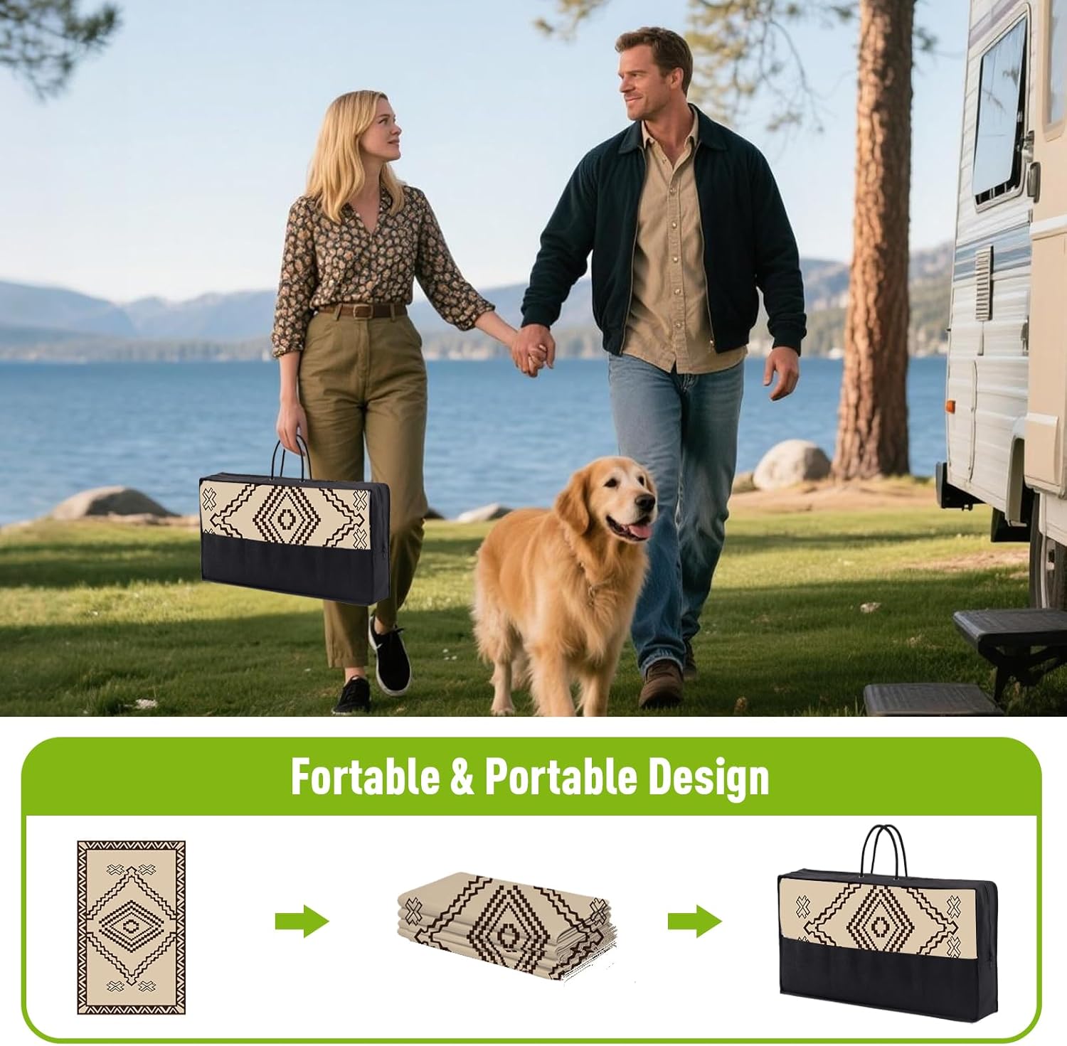 - Portable & Durable: This outdoor plastic rug with seams can be rolled or folded into a compact size and comes with a carrying bag for easy portability. Perfect for outdoor activities, picnics, sunbathing, and RV road trips. The heat-sealed edges prevent wear and tear, withstanding any environment, traffic, or scratches