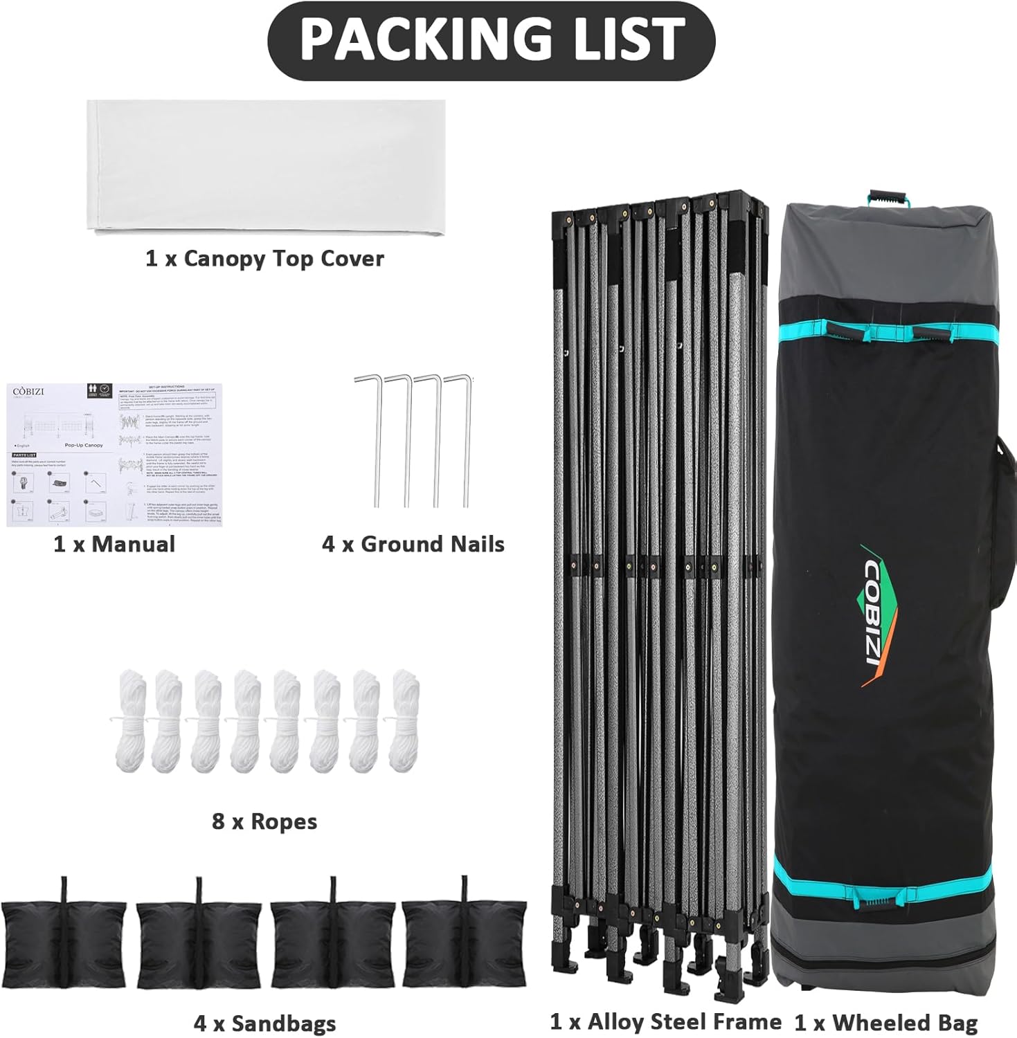 - 【Wheeled Storage Bag】10x30 canopy wheeled roller bag size is 164x66x24cm (64.6x25.9x9.5inch), 600D Oxford Cloth fabric. Storage bag with 3 wheels on the bottom for easy transport. 3 handle on the side for 2 people to lift. 1 handle on the top for 1 people to glide. The Package Includes: Pop up Canopy Frame x 1Pcs + 10′x30′ Canopy Tent Top Cover x 1Pcs + Sandbag x 4Pcs + Ground Nail x 4Pcs + Rope x 8Pcs + Wheeled Storage Bag x 1Pcs.