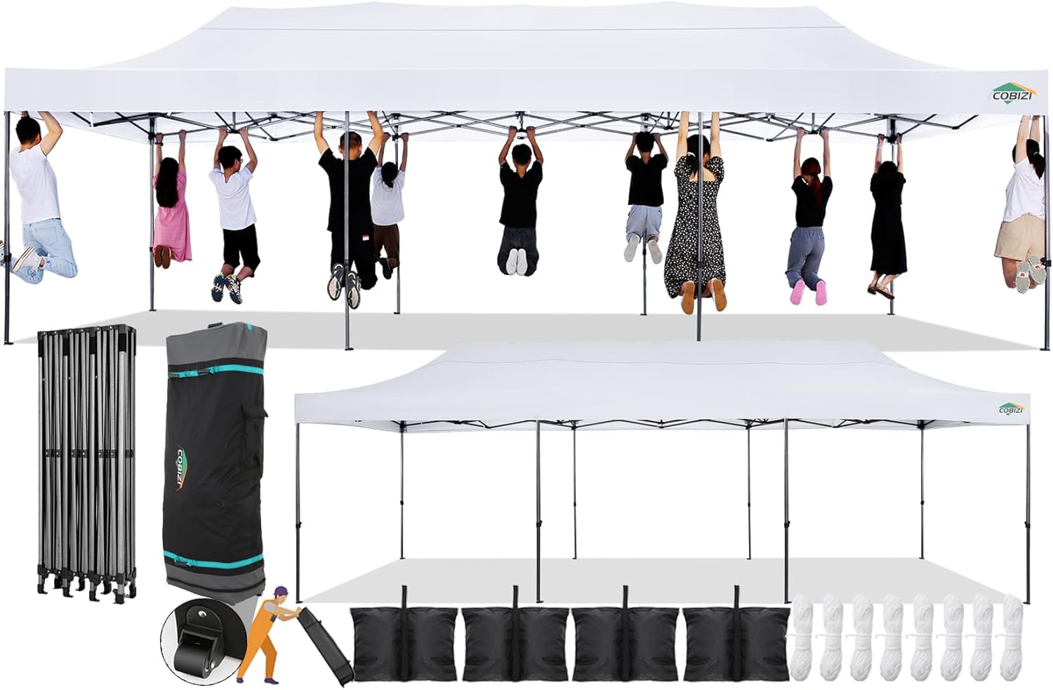 - 【300 SQ Feet Shade Area】COBIZI 10x30 pop up tent provides 300 SQFT spacious covered space, it can easily accommodate 15-20 people, meet your different needs for holding large gatherings. Perfect for wedding, birthday party, market event and other larger events. When in use, always secure the 10x30 pop up tent with the included stakes and ropes to avoid damage. One year after-sale protection for canopy frame; Six months after-sale protection for fabrics and accessories.
