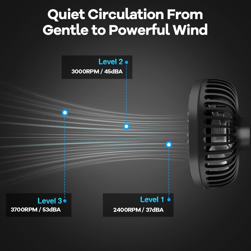 - Strong Airflow with Few Noise: The clip on double fans equipped with a 12W adapter can output max airflow 330CFM 3700 RPM with a few noise of 53dBA. In the lower speed level, the noise decrease to 37dBA. Also itโs IP54 waterproof which can work in a humidity environment.
