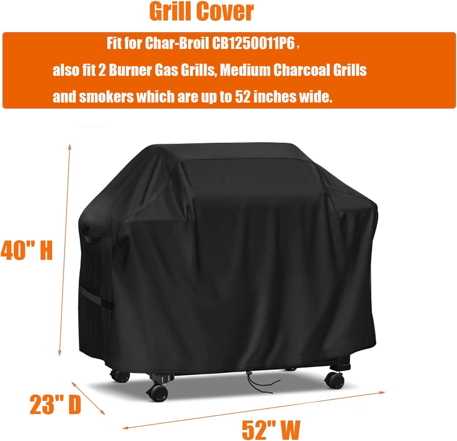 - Grill Cover Size: 52"W x 23"D x 40"H. Designed for Charbroil Performance Series- CB1250011P6. also fit 2 burner gas grills, medium charcoal grills and smokers up to 52 inches wide