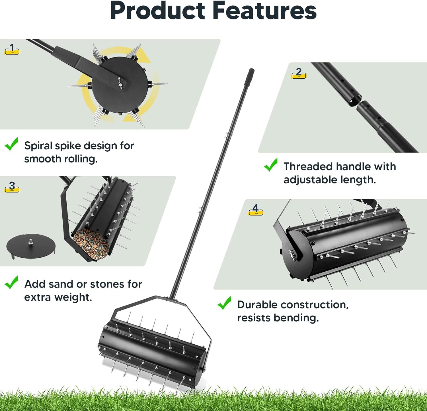 - High-quality Carbon Steel: Our manual lawn aerators is made of high-quality carbon steel, ensuring the durability and longevity of the tool. The inside of the drum can be filled with sand or stones to add extra weight, allowing the spikes to penetrate deeper into the soil and enhance soil aeration. This feature promotes lawn health by improving soil structure and nutrient absorption. Very suitable for efficient lawn care in ordinary households.