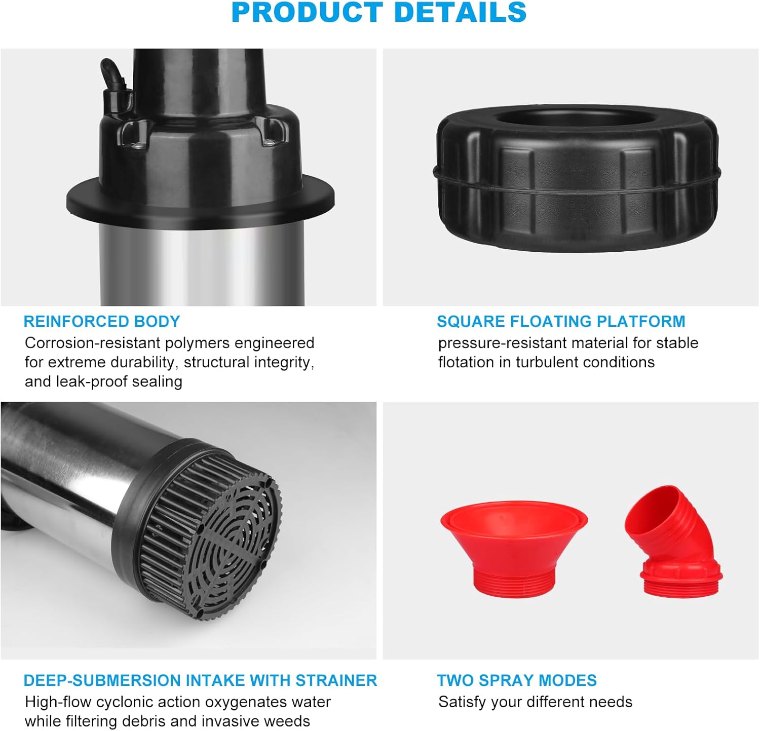 - 【Durable Aeration Design】Equipped with an energy-efficient 1HP pump (750W, 110V) and a high-quality PVC float, this aerator ensures long-lasting performance in various weather conditions and water environments. This pond aerator is ideal for enhancing outdoor ponds, lakes, landscape fountains, aquaculture setups, and irrigation systems. It helps promote cleaner, healthier, and more vibrant water.