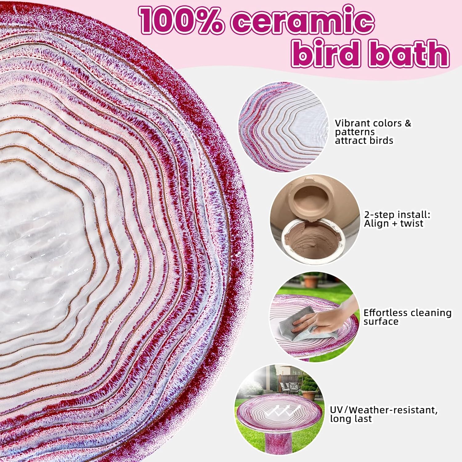 Ceramic Bird Bath for Outdoors – 18" H Birdbath Tool-Free Assembly, Hand-Glazed Earthenware with Non-Slip Bowl, Weather-Proof Sturdy Pedestal Design, Garden Decor(Red)