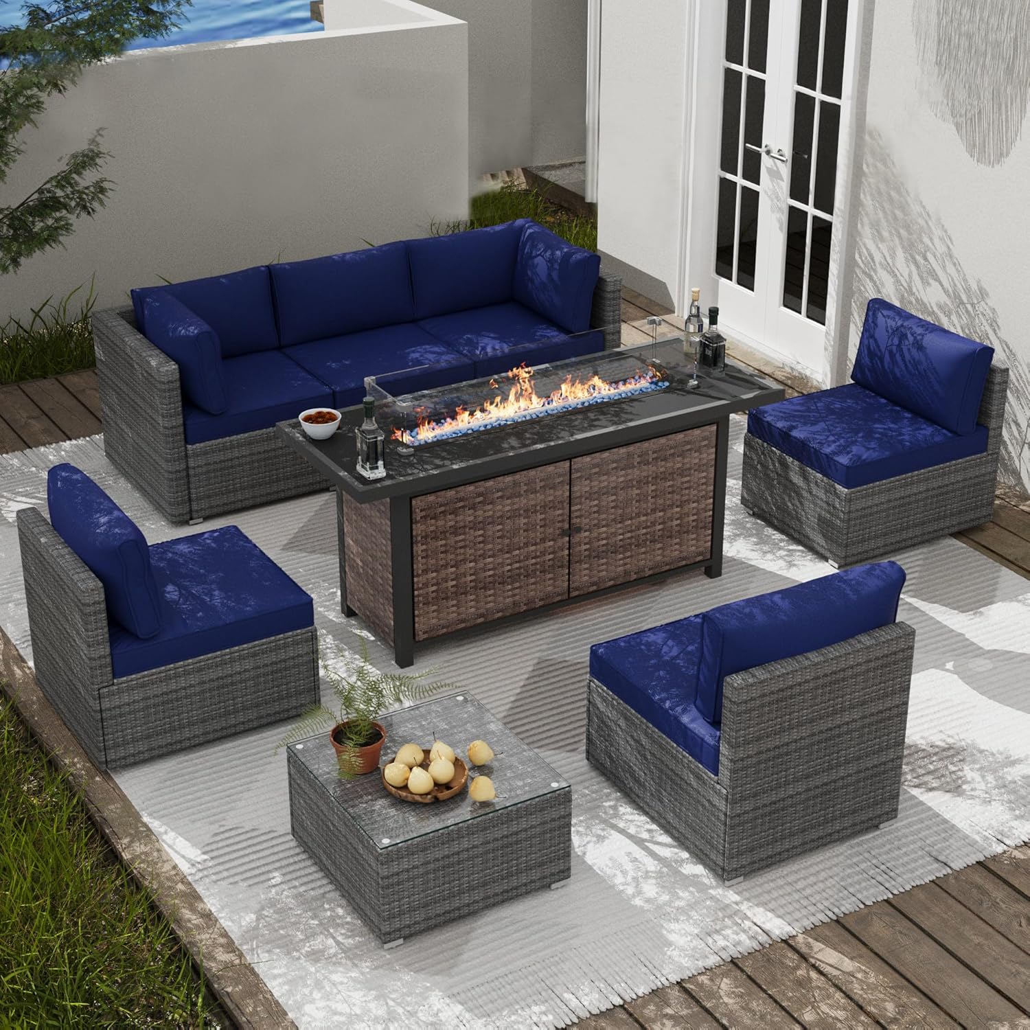 - 【Complete 25-Piece Set】 Includes 8 main furniture (1 Fire Pit Table + 1 Coffee Table + 2 Arm Chairs + 4 Armless Chairs) & 17 premium accessories (6 Seat Cushions + 8 Back Cushions + 2 Pillows + 1 Glass Windshield). Everything needed for instant outdoor living