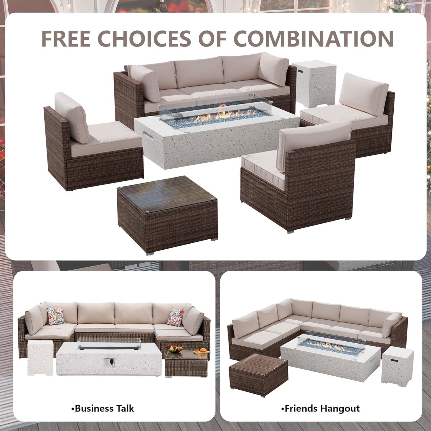 8 Piece Patio Furniture Set - Outdoor Conversation Sets with 56" Fire Table and Coffee Table, Rattan Modular Sofa Set for Garden/Poolside, Beige/Brown