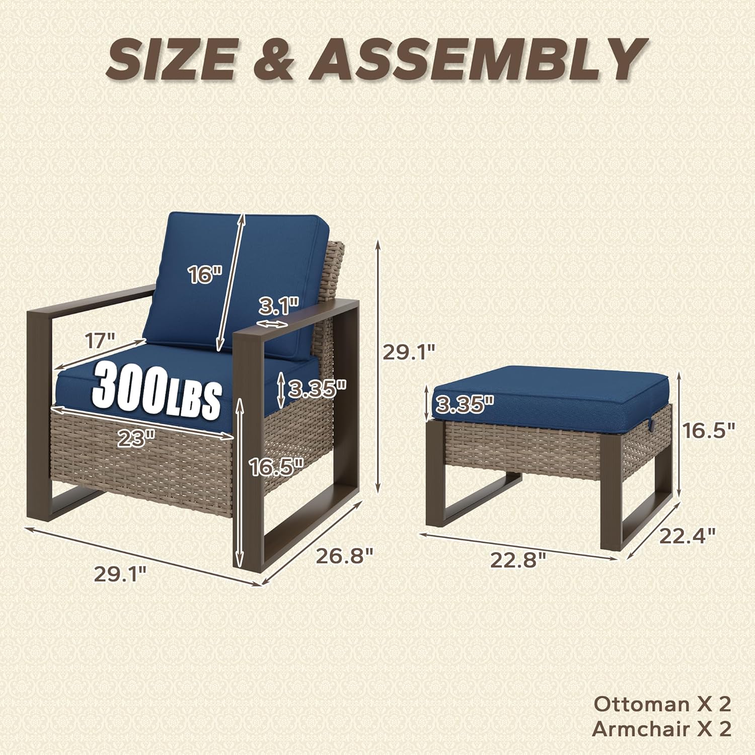 Outdoor Wicker Metal Chairs Set of 2 with Two Ottomans - 4 Pieces Patio Bistro Set with Rectangular Framed Wood-Looking Metal Armrest & Removable Cushions for Poolside, Terrace, Dark Blue