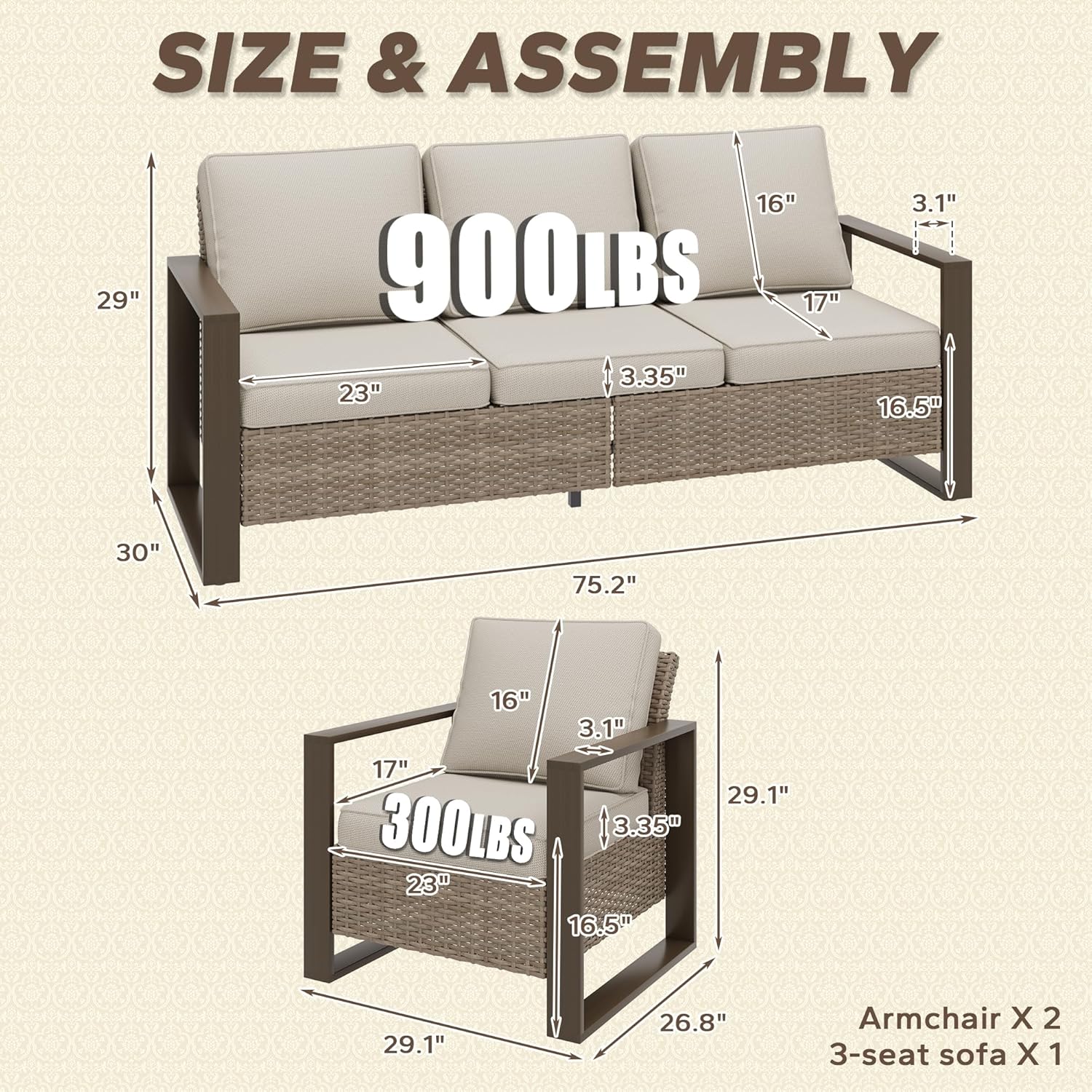 - DEEP SEATING & SPACIOUS ROOM: The wicker patio furniture set feature an extended seat panel, providing a snug feel while seated. There is ample space for an adult to sit and move around naturally