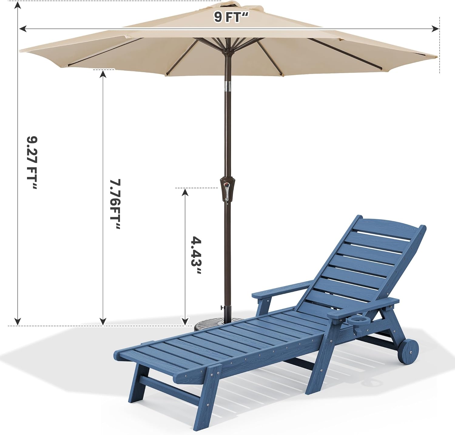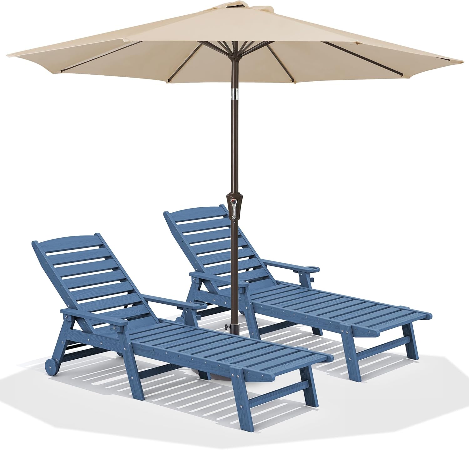 SERWALL Patio Chaise Lounge Chair Set of 2 with 9FT Patio Umbrella, 78'' HDPE Outdoor Lounger, Poly Lounge Chair with Rolling Wheels & Cup Holder for Pool,Blue (Umbreall Base not Included)