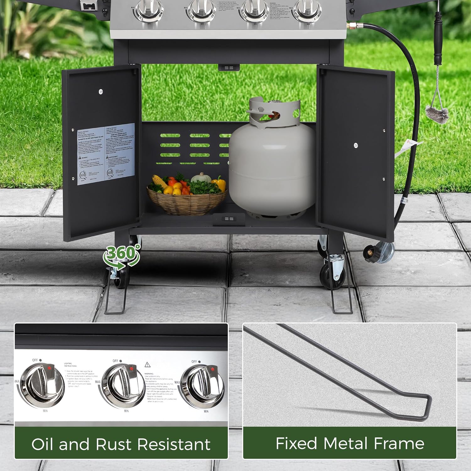 - SUPERIOR GRILLING PERFORMANCE: Our advanced 4-burner gas grill delivers 10,000 BTUs of heat per burner, heating up quickly in just 10 minutes and distributing heat evenly for outstanding grilling results. The built-in precision thermometer lets you control the temperature with accuracy, whether you're searing on high heat or locking in juices on low heat. Say goodbye to undercooked or burnt food