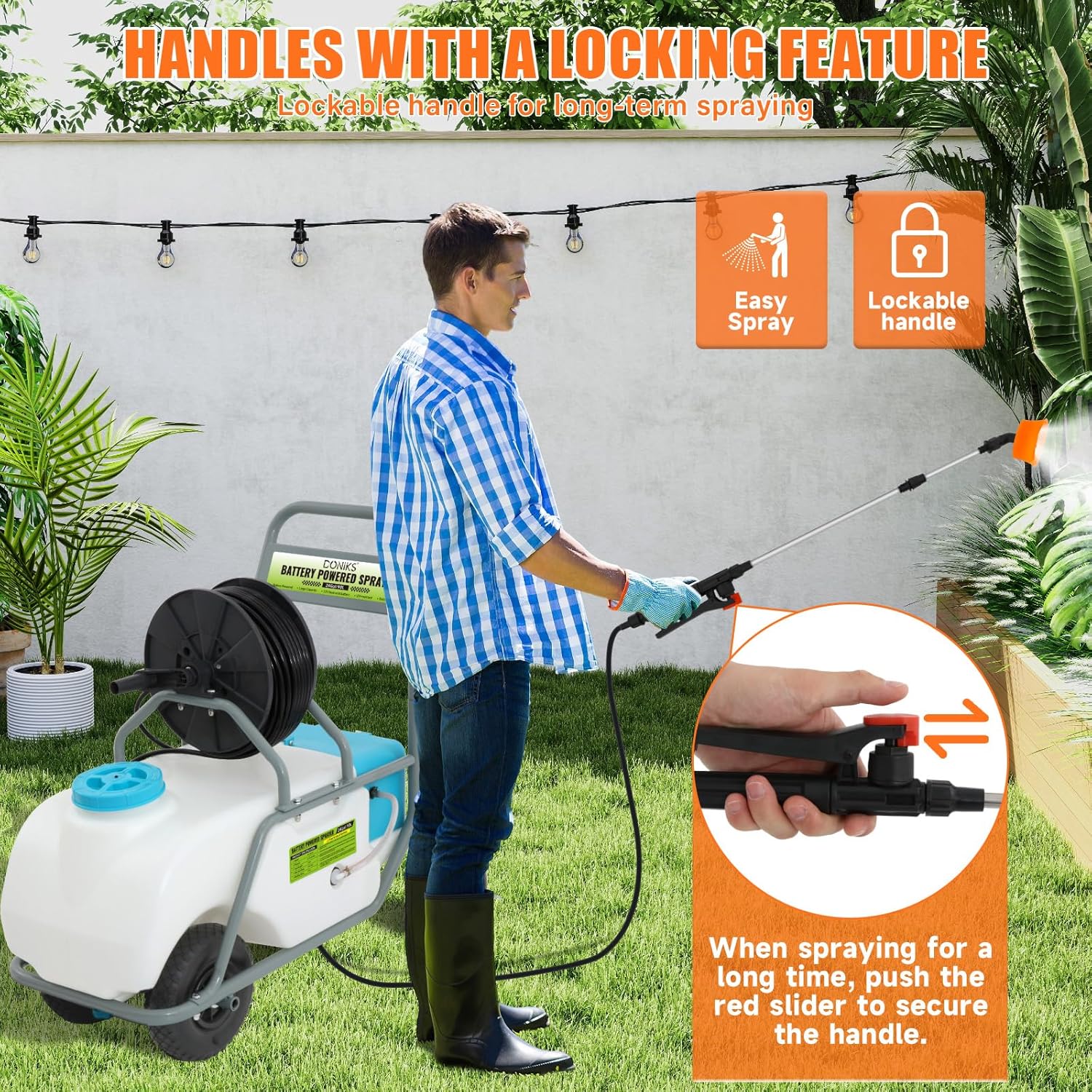 - 【Sturdy Push-Cart Design with Easy Maneuverability】-Built with a heavy-duty steel frame and four durable wheels (including two swivel wheels), this sprayer moves smoothly over rough terrain. Locking brakes provide stability on slopes, making it ideal for uneven ground and large properties.