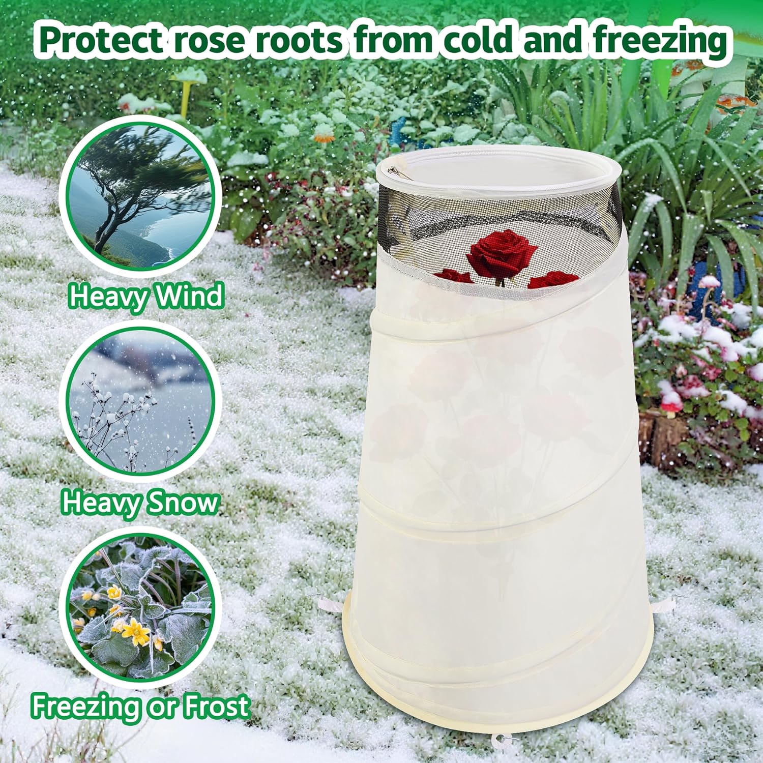 - Package Includes: You will receive 1 pc pop-up winter rose rrotective covers, with a bottom diameter of 13 inch, a top diameter of 9 inch, and a height of 20 inch, and 4 ground stakes. Prevent rose branches from freezing in winter, keep the roots alive, and still be able to grow and flower the next year.