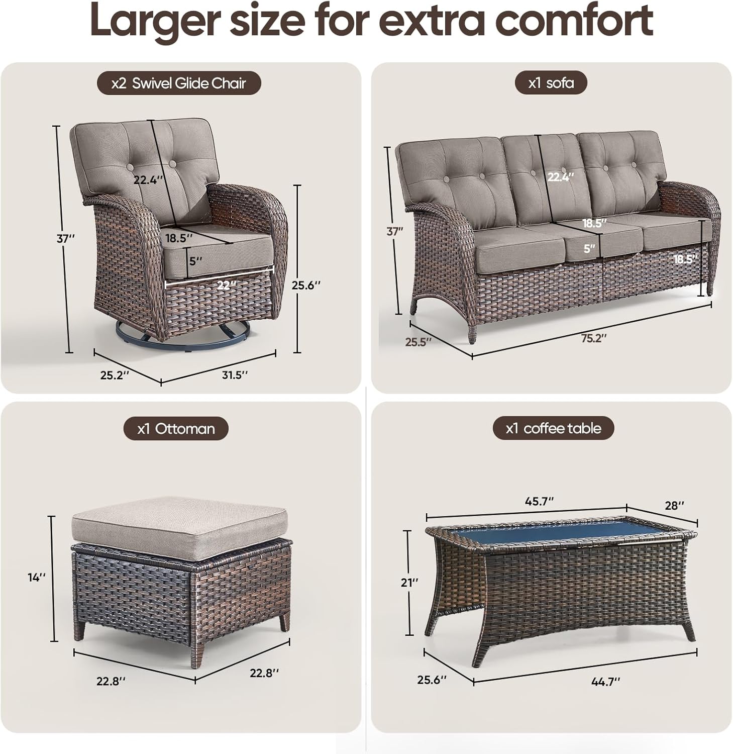 - 【Balcony Furniture Set Includes】: 6-piece balcony furniture set includes 2 swivel chairs, 1 glass coffee table, 1 sofa, and 2 footstools; the footstools can be used not only for resting your legs but also as a small table or stool. The swivel chairs can support up to 350 pounds