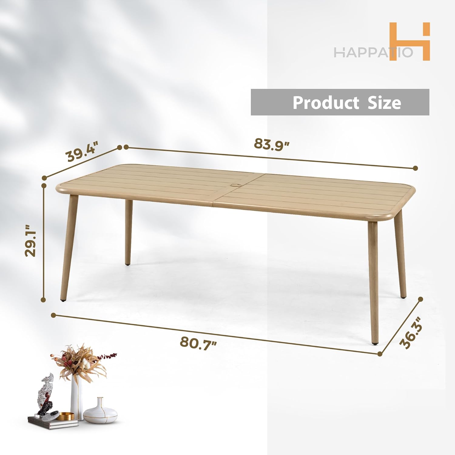 HAPPATIO Outdoor Dining Table for 8, Large Rectangular Aluminum Frame Patio Dining Table, Wood-Like Tabletop with 2" Umbrella Hole for Deck, Backyard, Lawn, Garden