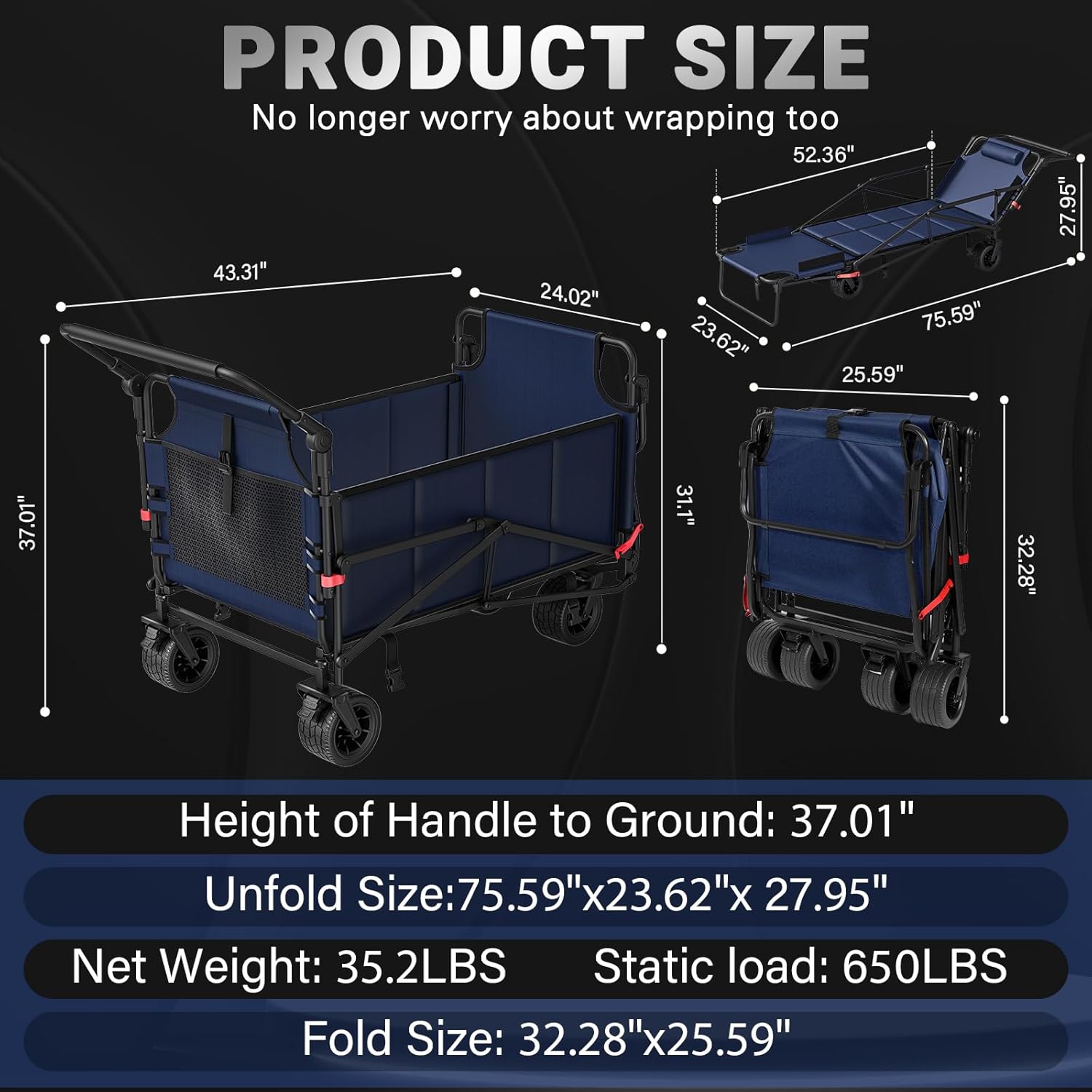 - [Product Size &Large Capacity]The 2-in-1 wagon cart takes only a minute to assemble,Extra large storage space(Cart Mode: 41.5" L x 20.5" W x 36" H .Chair Mode: 70.5" L x 21" W x 25" H). Included two elastic cords to meet your daily needs
