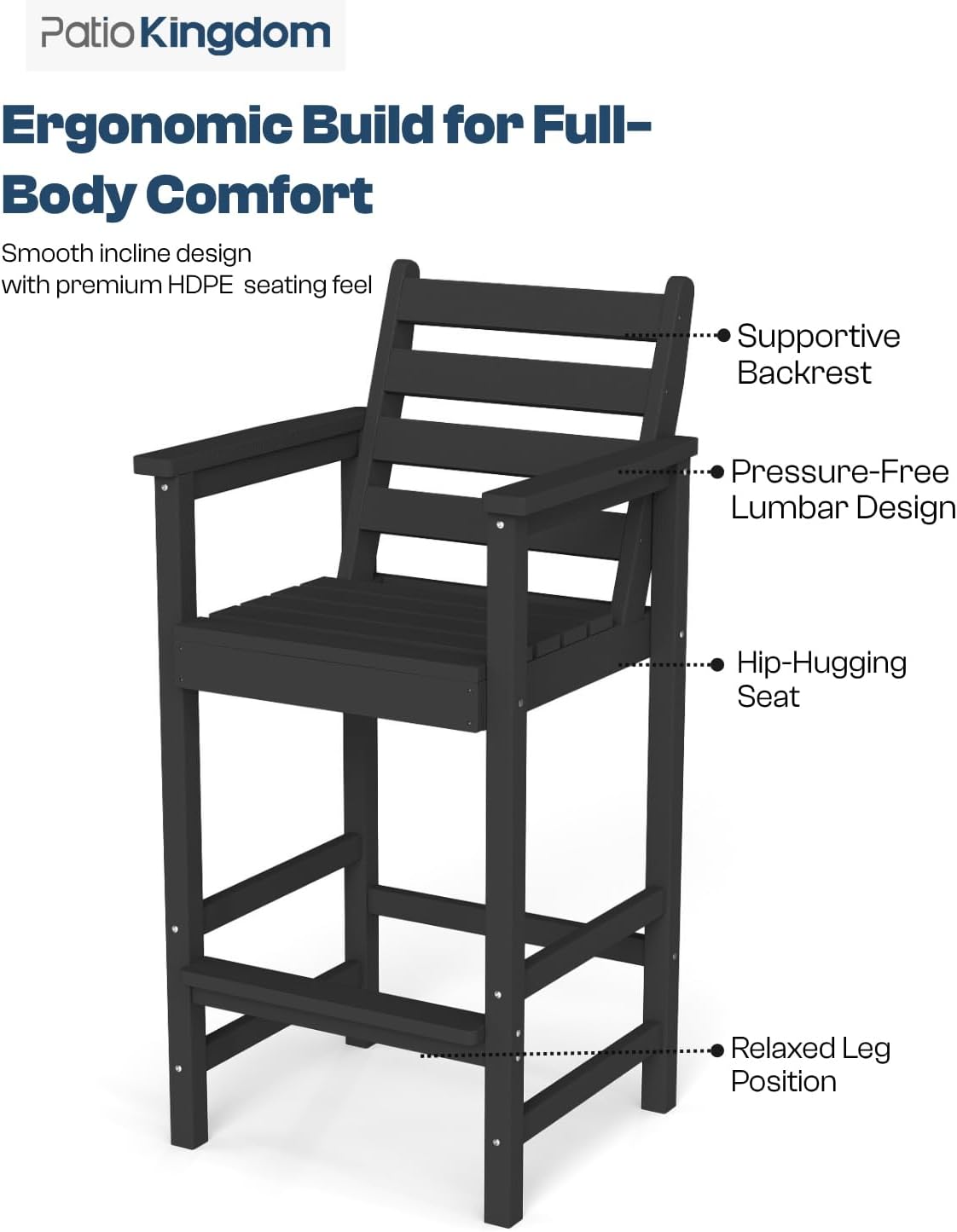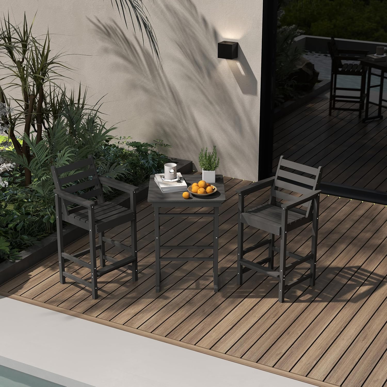 - Durable All-Weather Build: Crafted from HDPE with a realistic wood-like texture, Patio Kingdom outdoor bar table and chairs set is built to withstand sun, rain, wind, and snow without fading, cracking, or peeling. Perfect as outdoor deck furniture, backyard seating, or patio bar sets, it offers reliable, year-round performance for any outdoor living space.