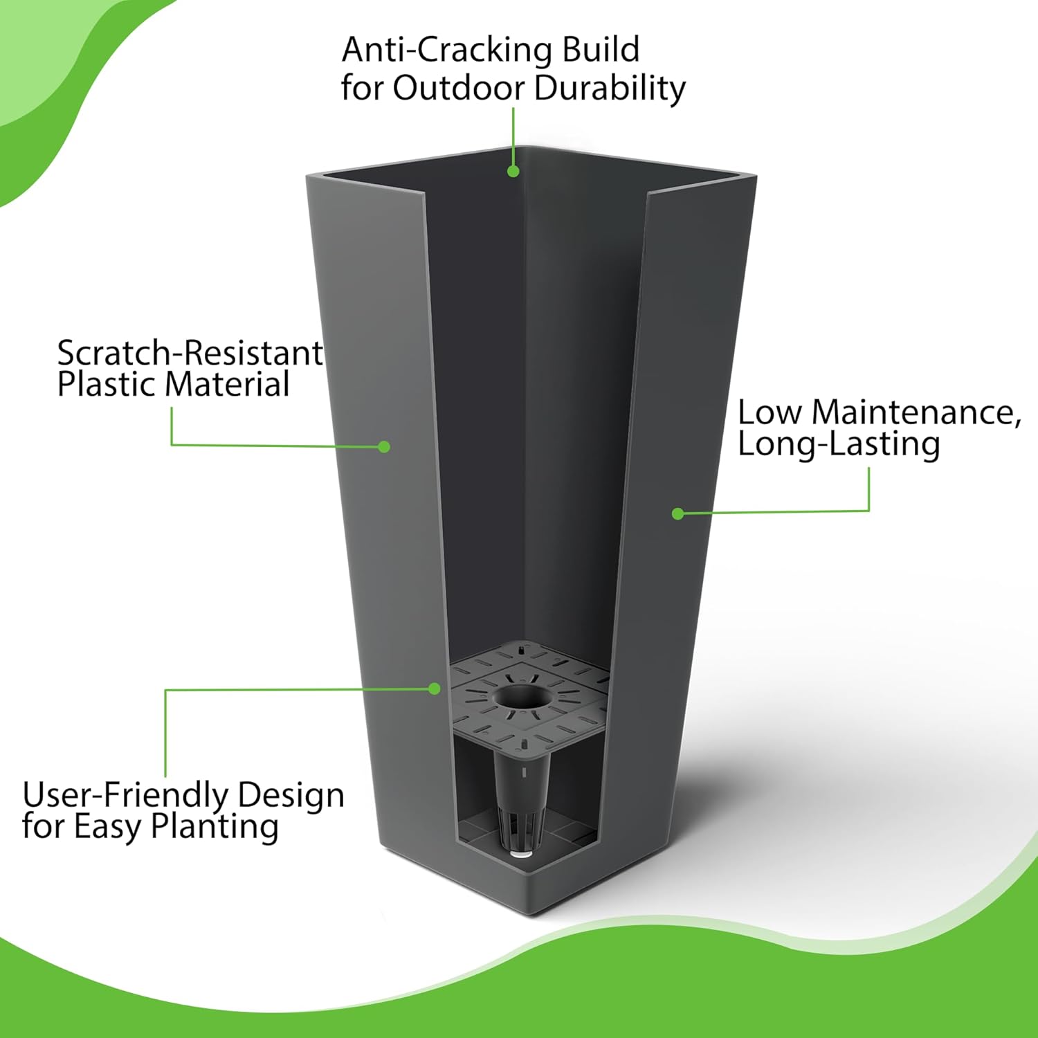 - Built to Endure All Weather Conditions: Crafted from premium, weather-resistant plastic, these tall planters for outdoor plants are designed to resist cracking, fading, and damage from the sun, rain, and snow. Perfect for any season, these large planters for outdoor plants ensure long-lasting durability, making them an excellent choice for outdoor and indoor gardening alike.