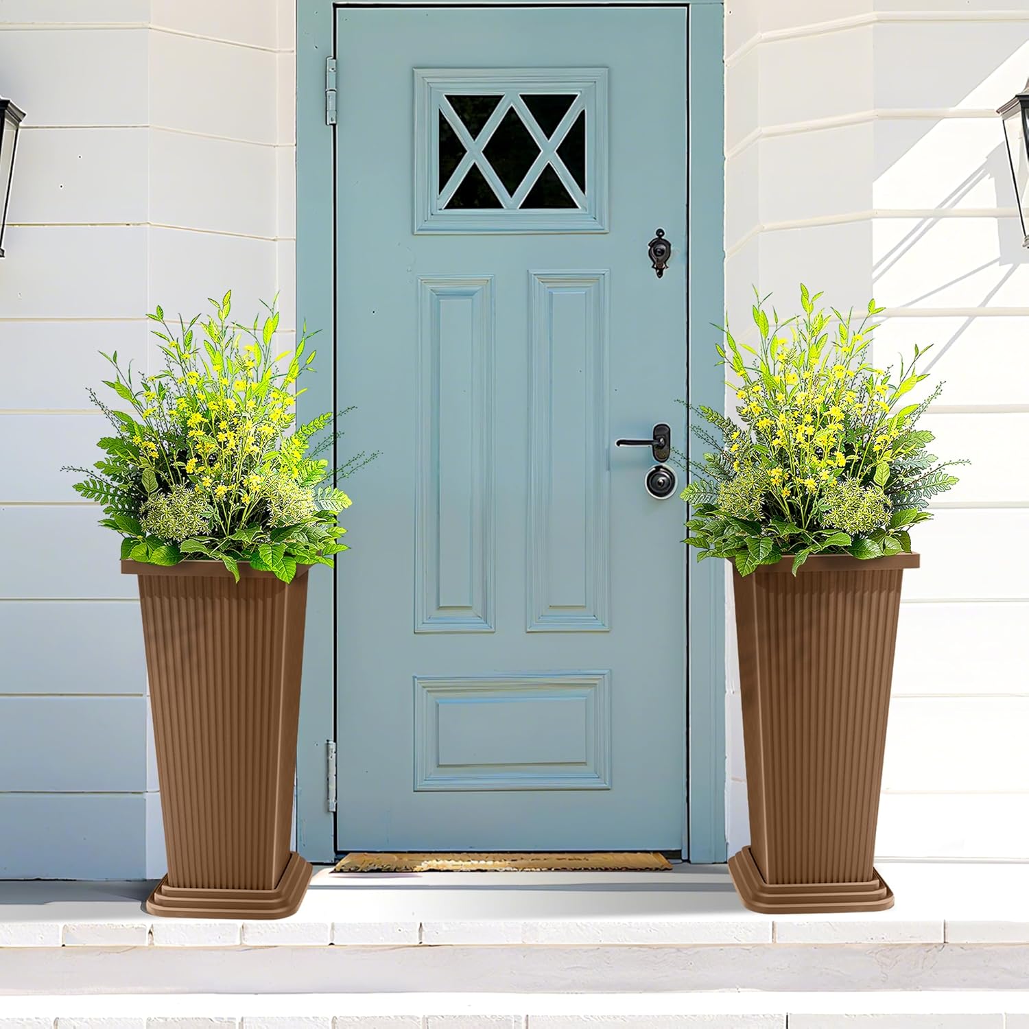 FENCY Set of 2 Tall Planters for Outdoor Plants, 24 Inch Large Tapered Pots with Drainage Trays, Weather-Resistant Plastic Plant Containers for Patio, Porch, Garden, Front Door Decor,Brown, Striped