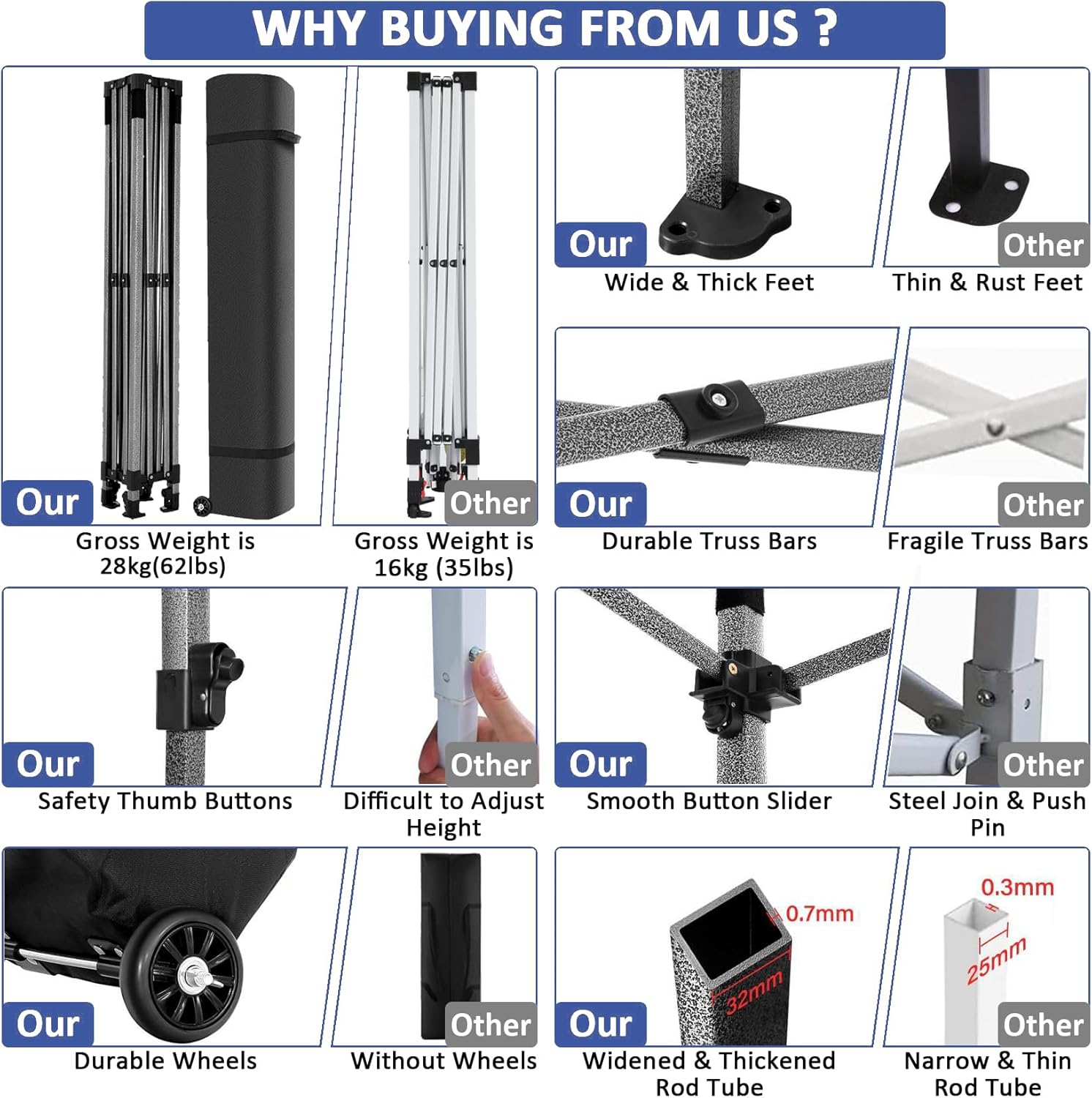- 【Heavy Duty Alloy Steel Frame】The upgraded 10x10 commercial pop up canopy tent frame can hold up to 220 lbs (100 kg) on a single pole. The frame can hang 5 adults at the same time! Can withstand 4 winds.(<18 mph). 10x10 party tent with an upgraded alloy steel full truss structure, and reinforced plastic parts at the stress points at the intersection of the peaks and poles. 10x10 heavy duty canopy frame with powder coated coating guarantees rust resistance and corrosion resistance.