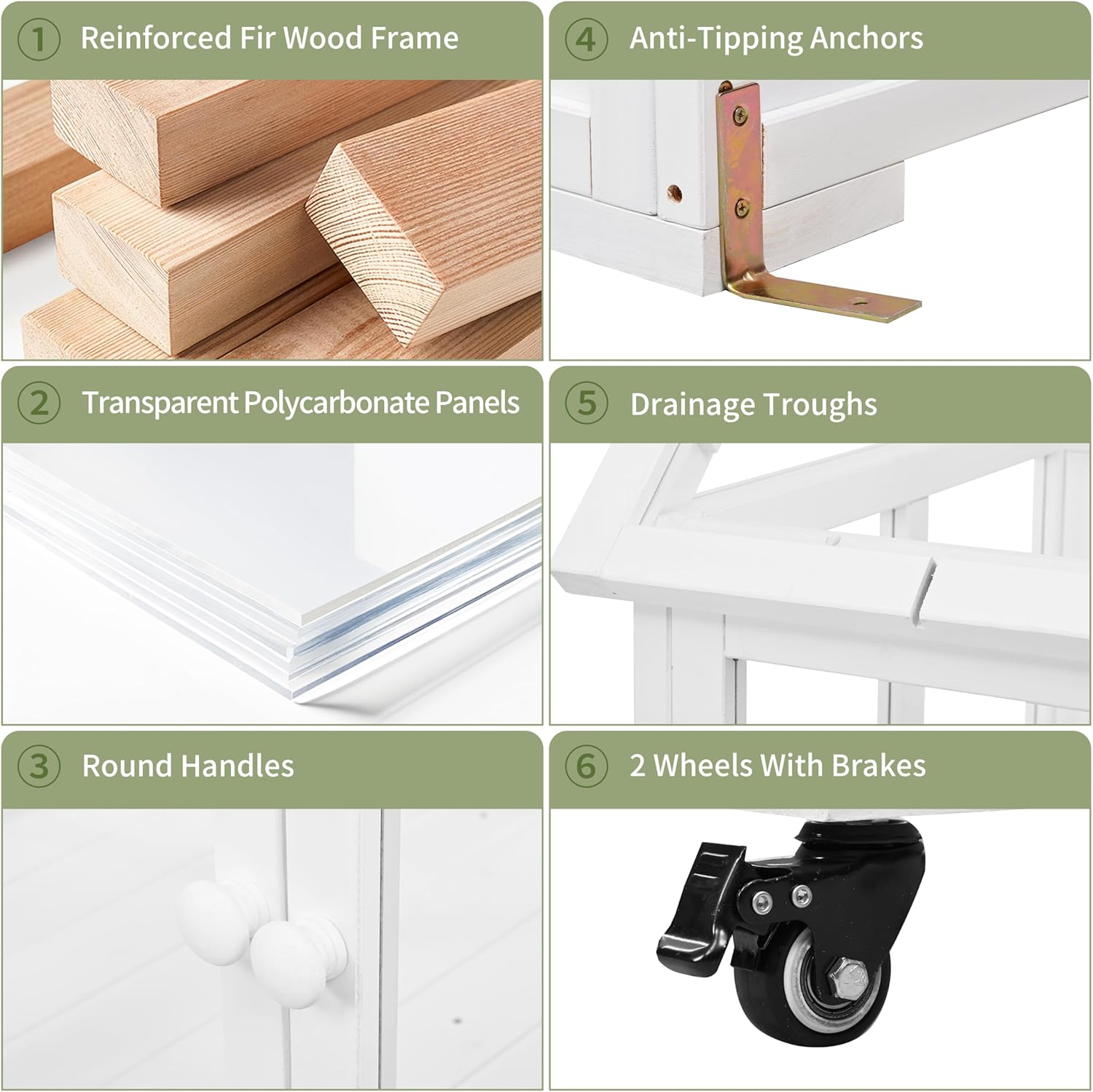 - 🌲【Durable Fir Wood & Polycarbonate Construction】 Built with 100% fir wood and transparent polycarbonate panels, this greenhouse offers exceptional durability. The panels diffuse sunlight evenly, protecting plants from harsh light while maintaining an ideal growing environment for seedlings, herbs, and winter crops