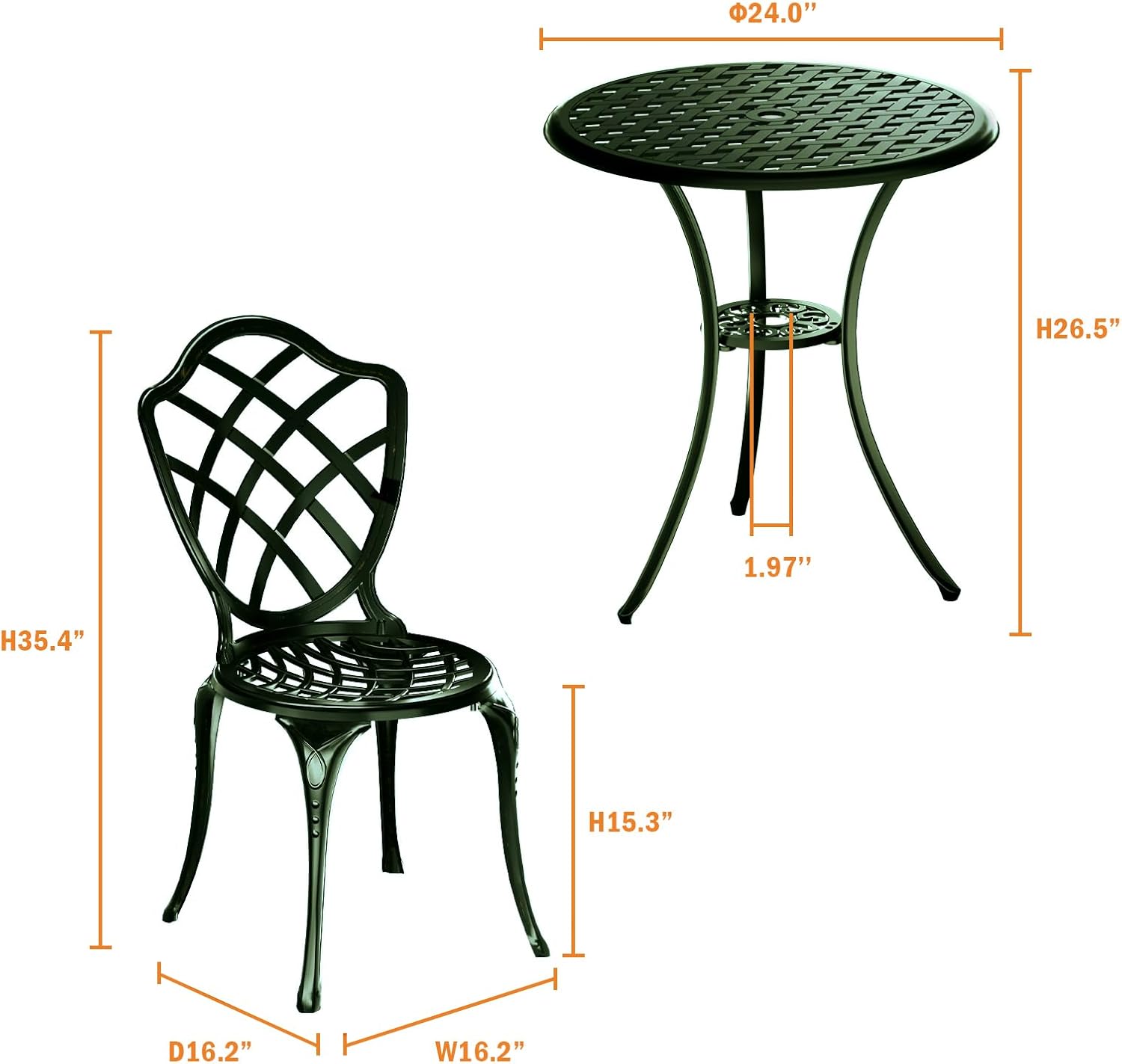 - 【Patio Bistro Set】Contains 1 round cafe table and 2 chairs. Table dimensions: Dia 24" x H 26.5". Chair dimensions: 16.2"D x 16.2"W x 35.4"H with a maximum weight capacity of 200 lbs