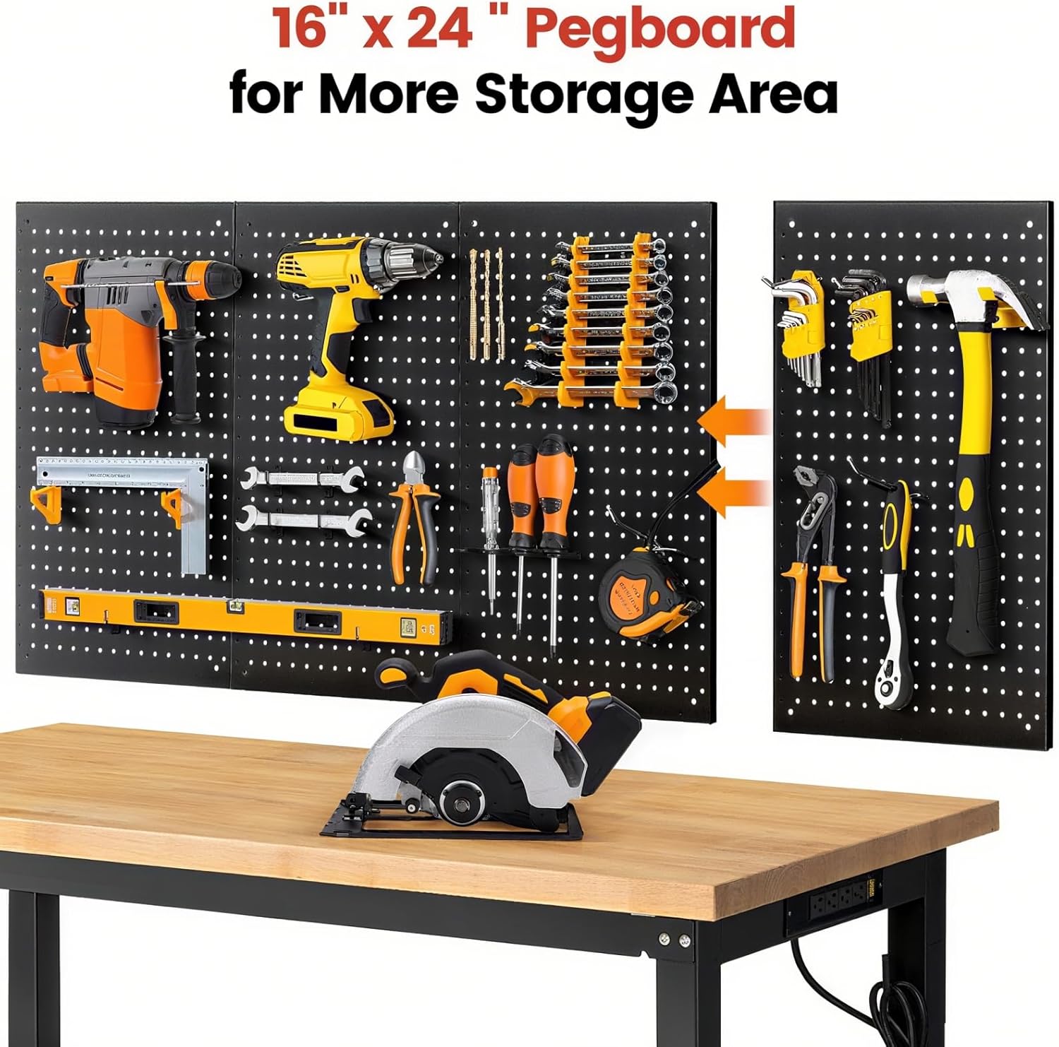Work Table for Garage 60 x 22 Inch Adjustable Height Workbench Heavy Duty Rubberwood Tabletop Work Bench with Power Outlets Pegboard Pad for Woodworking Shop, Home, Office