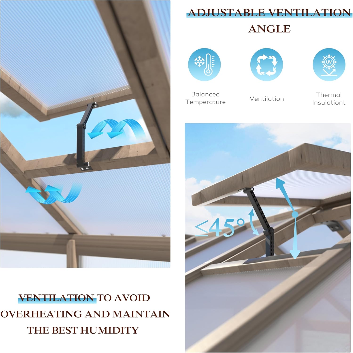 - Adjustable Ventilation: Our greenhouses provide fresh space for your plants and promote optimal plant growth through Windows with adjustable opening angles. Vents located at the top allow you to regulate airflow and maintain the ideal interior environment of the greenhouse, providing a healthy ventilation system and balanced temperature for your vegetables, herbs in different seasons.