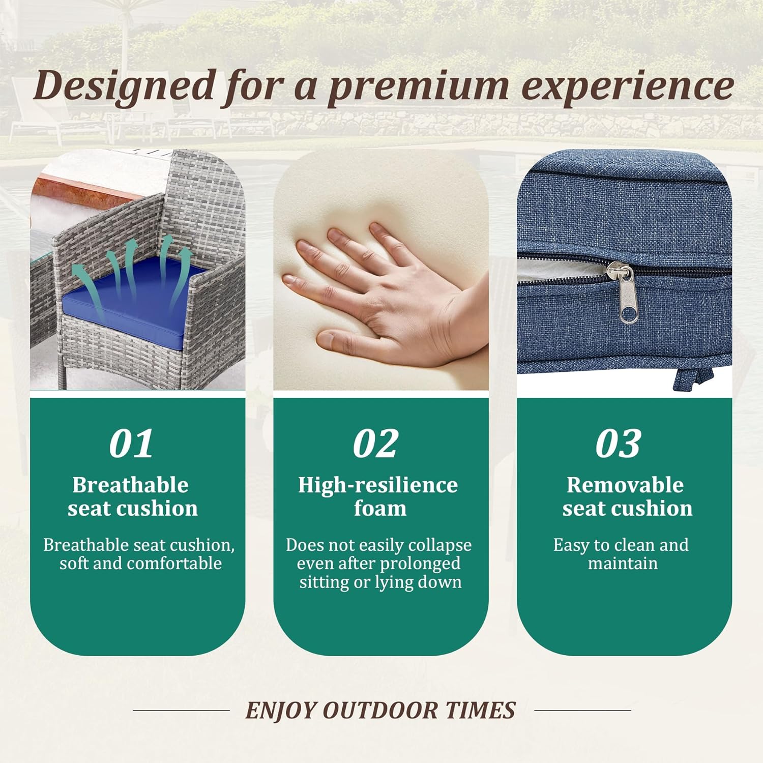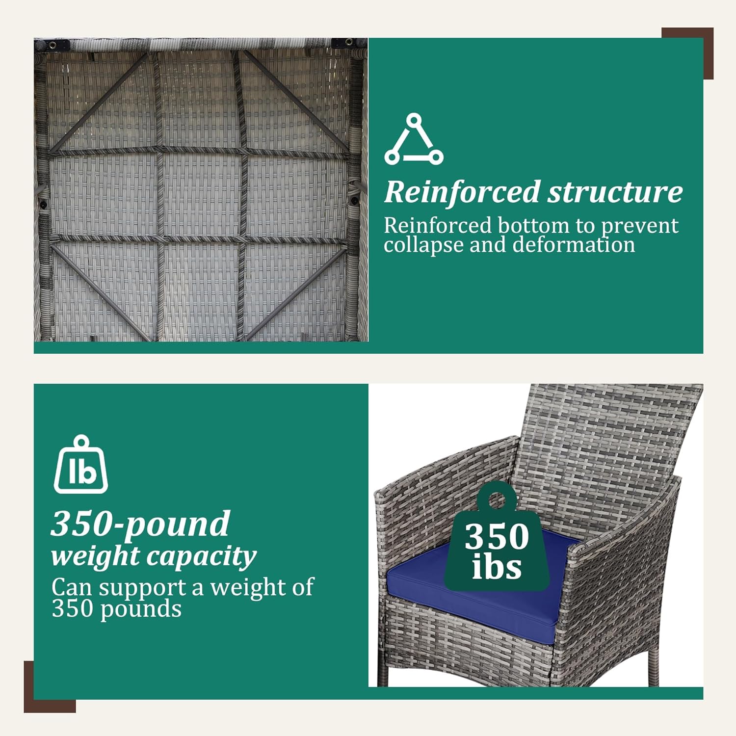 3 Piece Patio Furniture Set - Outdoor Conversation Sets with Coffee Table, Rattan Chair Set for Garden/Poolside, Grey/Navy Blue