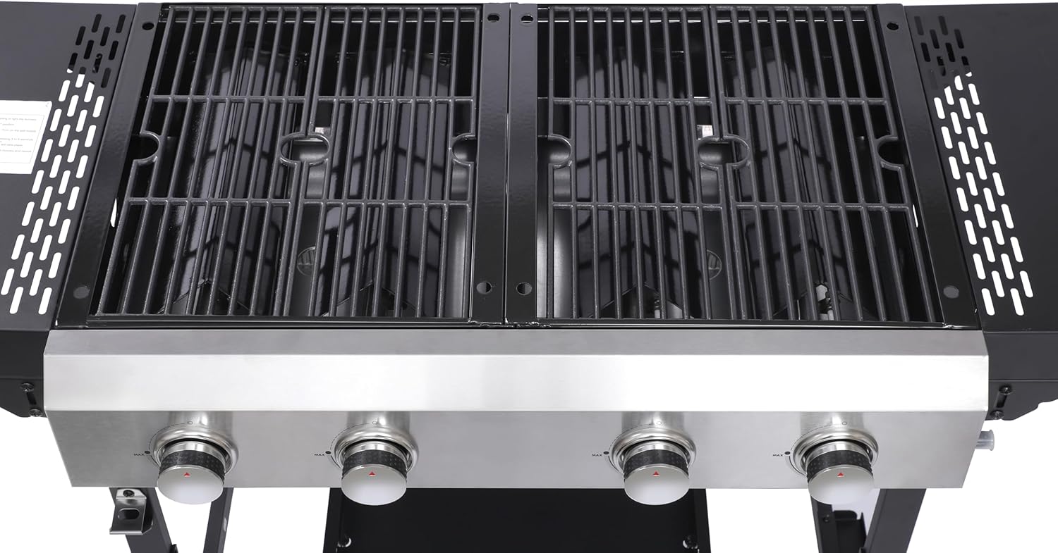 - π₯ Massive 38,200 BTU Output β Four primary burners + side burner for full meal prep.
