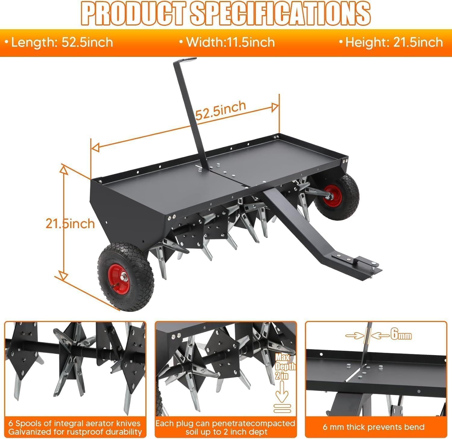 - 【Easy to Assemble and Operate】-The 52-Inch Tow Behind Spike Aerator comes with an instruction manual, you can easily complete the assembly according to the instruction manual, saving your time and easy to operate. Easily attach to any lawn tractor and most ztrs and ATVs.