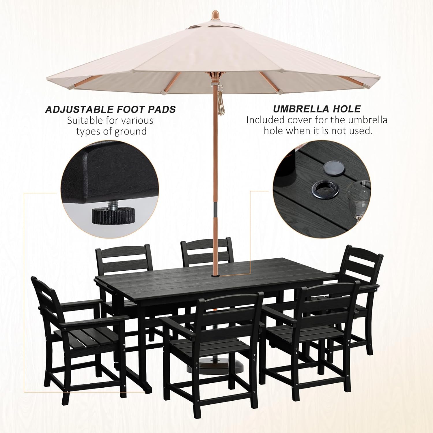 7pcs Outdoor Dining Set, HDPE Patio Dining Set for 6, All-Weather Outdoor Table and Chairs with Umbrella Hole & Adjustable Pads, Modern Patio Furniture Set for Backyard, Poolside &Lawn (Black)
