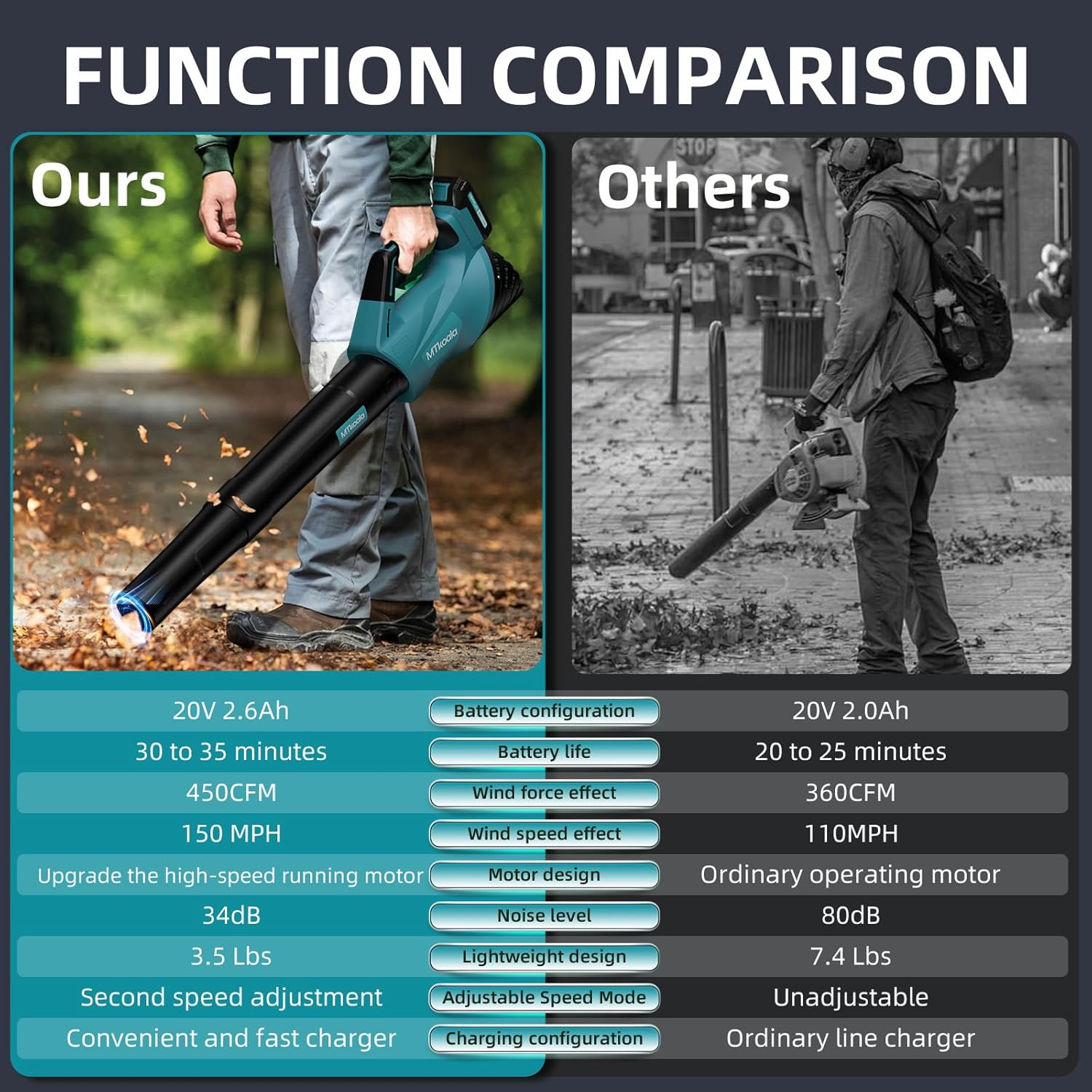 - 【Significant Highlights of MTK】Upgrade Powerful Motor& High Battery Capacity 2*2.6Ah & Fast Charger&Quiet and Lightweight Design,up to 450 CFM and150 MPH,effectively improving air volume and wind power. It can operate continuously for 30-35 minutes,outperforming 99% of sellers on the market who offer a battery life of 10&20 minutes, you can take care of your garden and backyard more efficiently,which is far beyond the market 2.0 Ah, sufficient battery capacity can help you work efficiently.