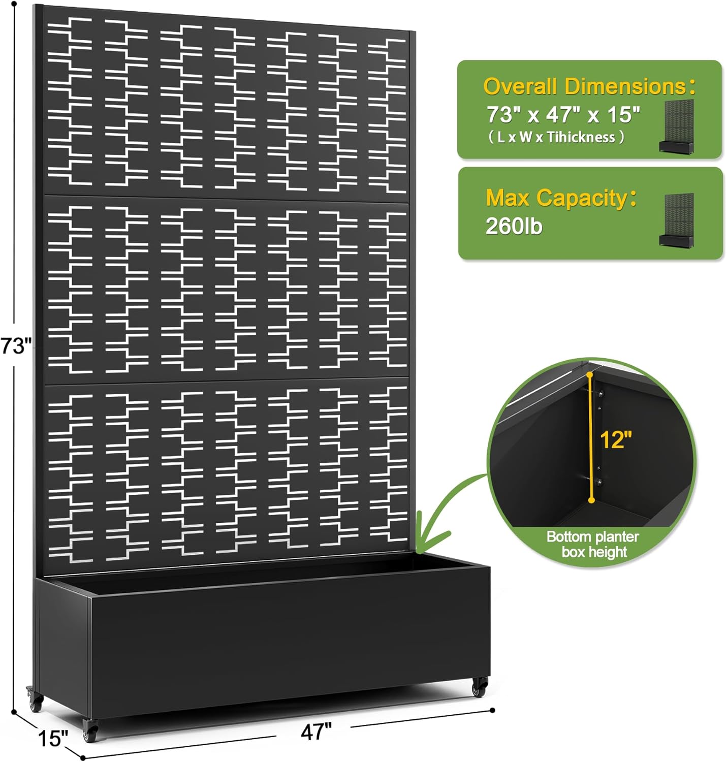 - 【Planter Box with Drainage Hole】Designed with a 12” deep planting bed and equipped with drainage holes at the bottom, this planter box provides ample space for healthy plant growth, ensuring excess water can escape and preventing waterlogging.