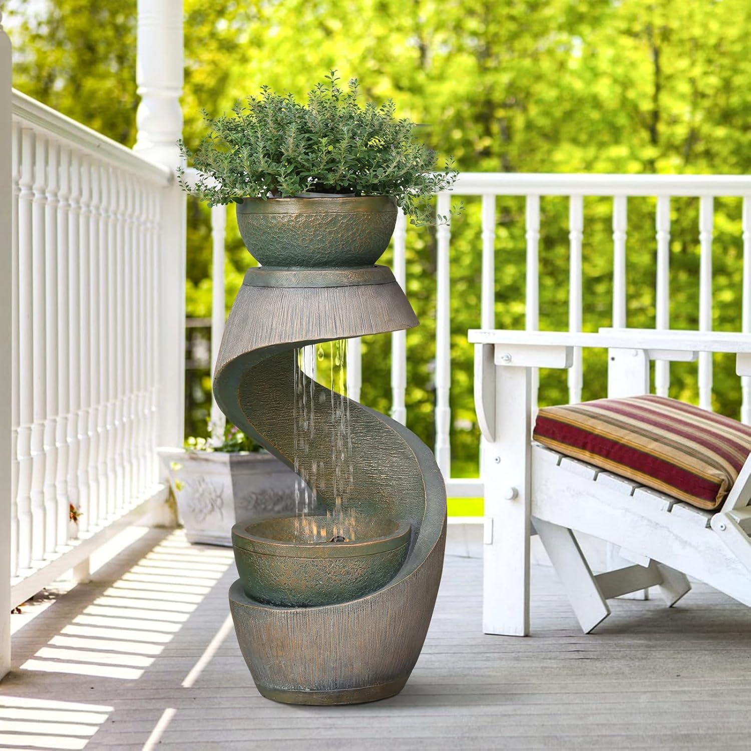 - Bright LED Lighting for Porch or Patio Charm Equipped with built-in LED lights, this fountain with lights illuminates the flowing water, creating a vibrant and inviting ambiance. Perfect as a small outdoor water feature for your patio, porch, balcony, or entryway, it turns any evening into a relaxing and refreshing retreat.