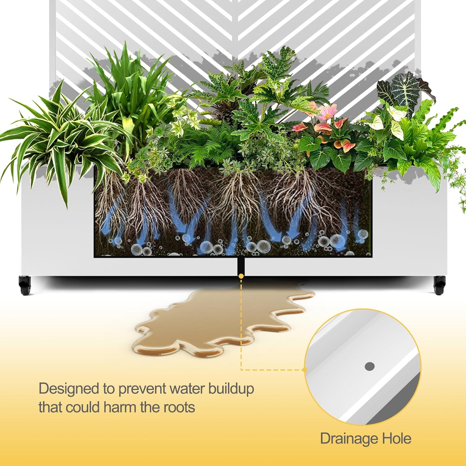 - Built-in Drainage System This planter box features a 12-inch deep planting bed equipped with drainage holes to effectively prevent water accumulation, ensuring plants receive the proper moisture for healthy growth. This design helps maintain optimal soil moisture levels and avoids issues caused by overwatering.