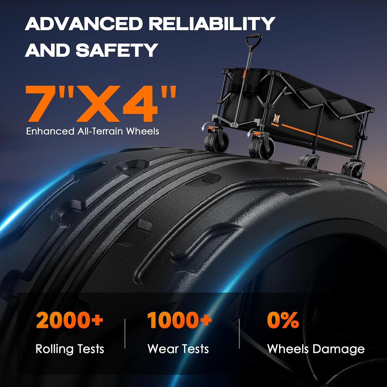 - All-Terrain Wheels & Dual Brakes: Dual-bearing wider wheels glide smoothly over grass and gravel roads. Front dual brakes lock the wagon with a step—no sliding even on slopes, maximum safety. 360° front wheels for easy steering. (Warm Notice: Not for soft sand).