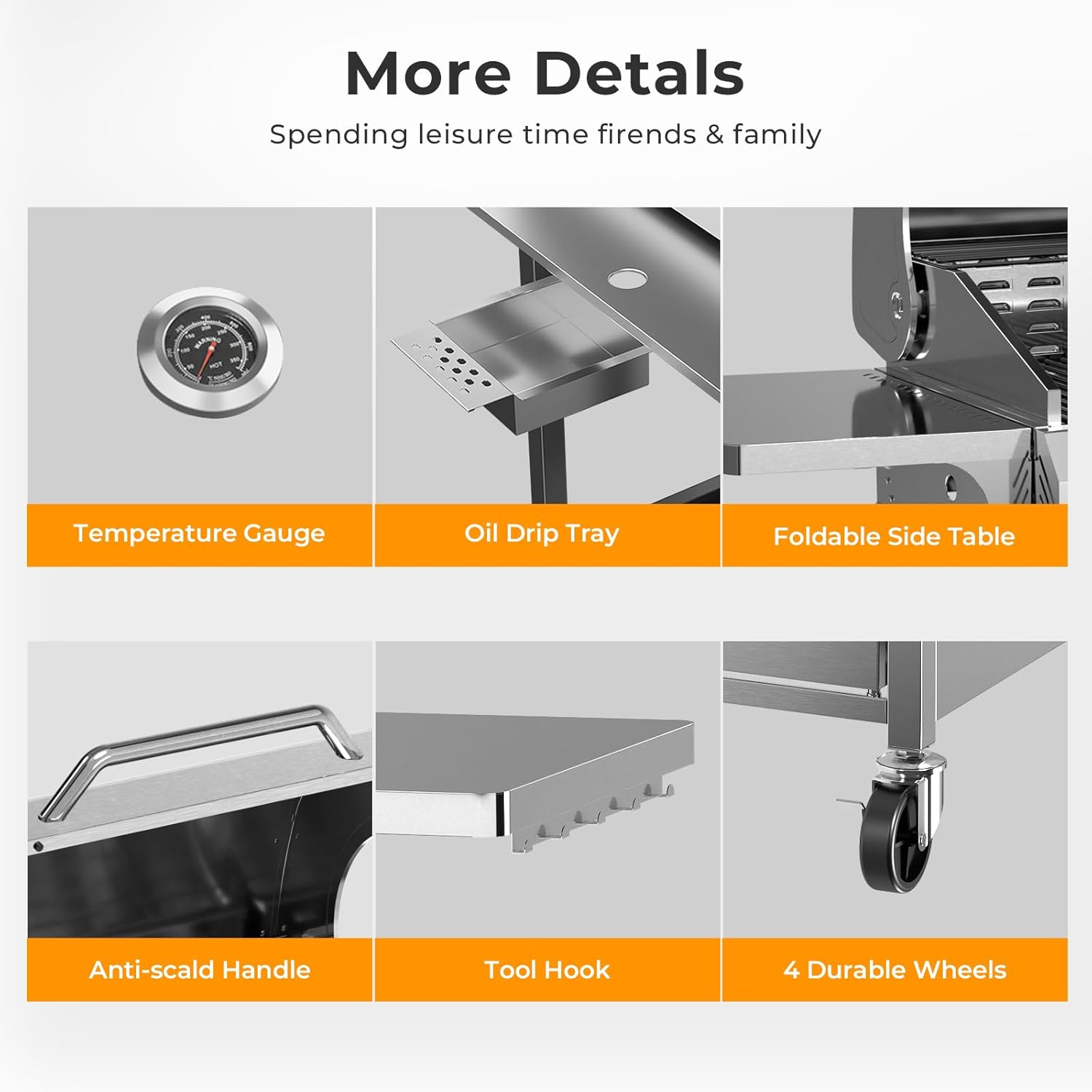 - YOUR OUTDOOR HERO: The barbecue gas grill is designed with outdoor convenience in mind. Featuring four wheels for easy mobility, a lid that preserves heat, a built-in thermometer for precise temperature control, ensuring optimal grilling results. Ideal for enhancing your outdoor cooking experience.