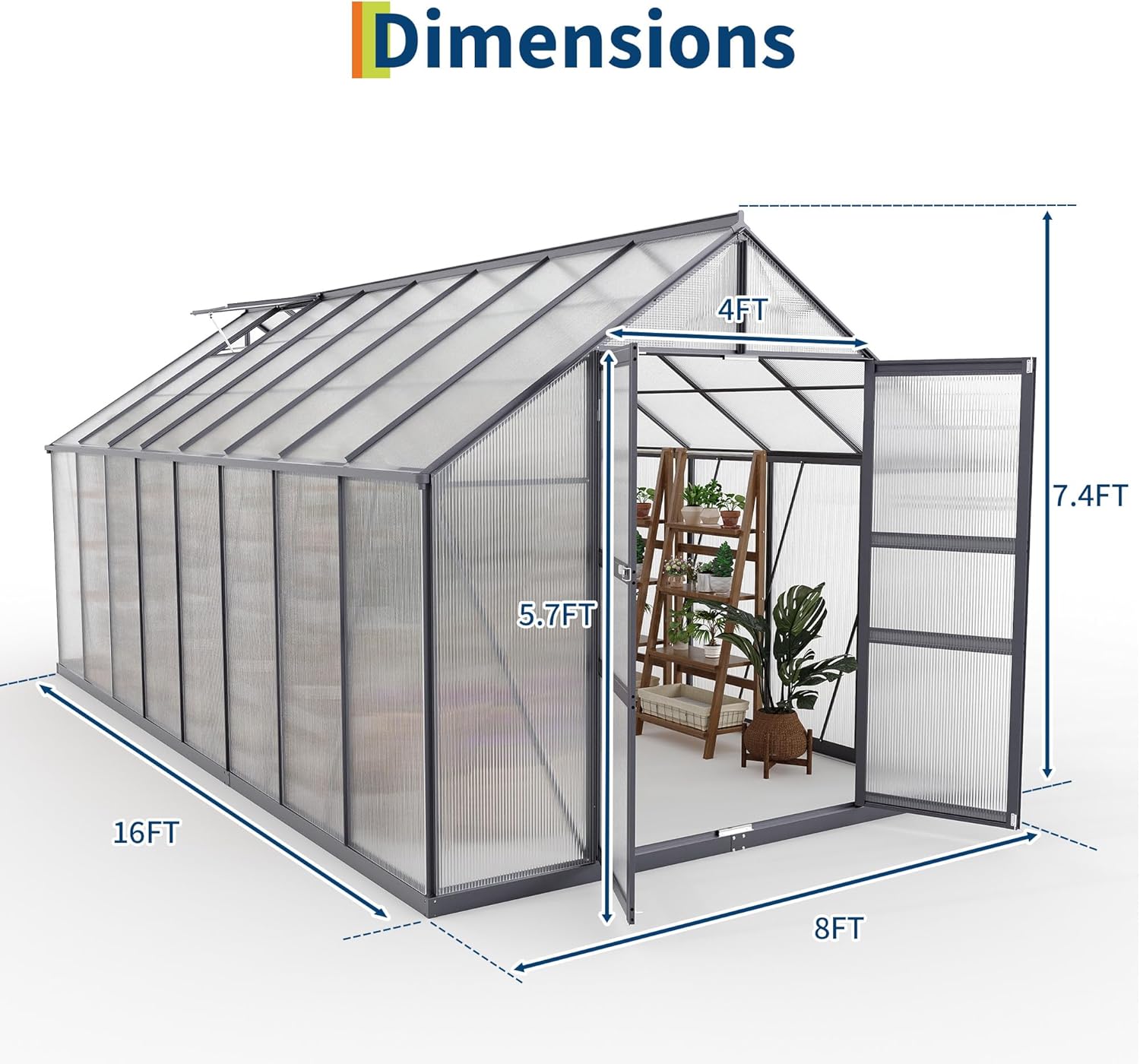 8*16 FT Outdoor Walk-in Greenhouse, Polycarbonate Green House, Heavy Duty Greenhouse with Vented Roof Window, Windproof Aluminum Frame, Suitable for Outside Gardening, Backyard, Patio