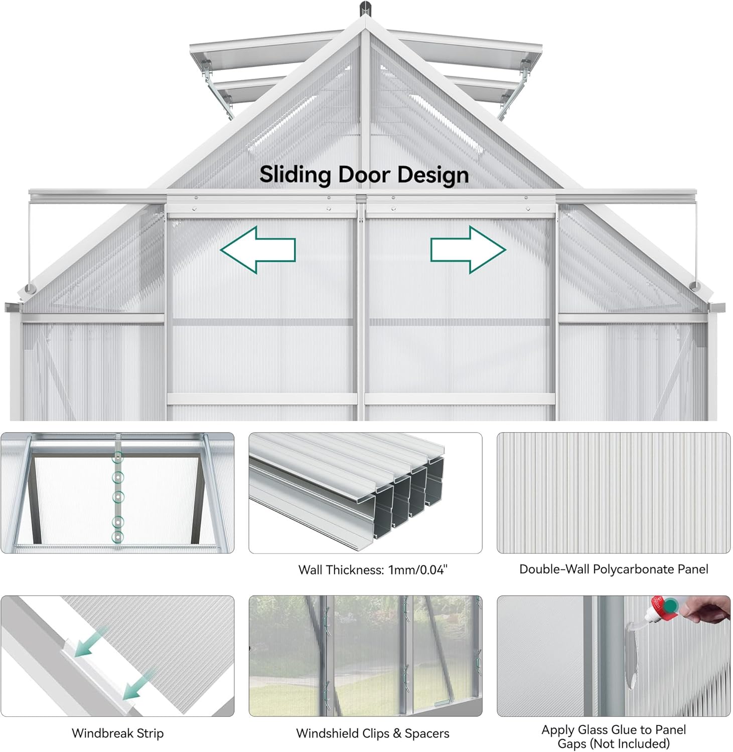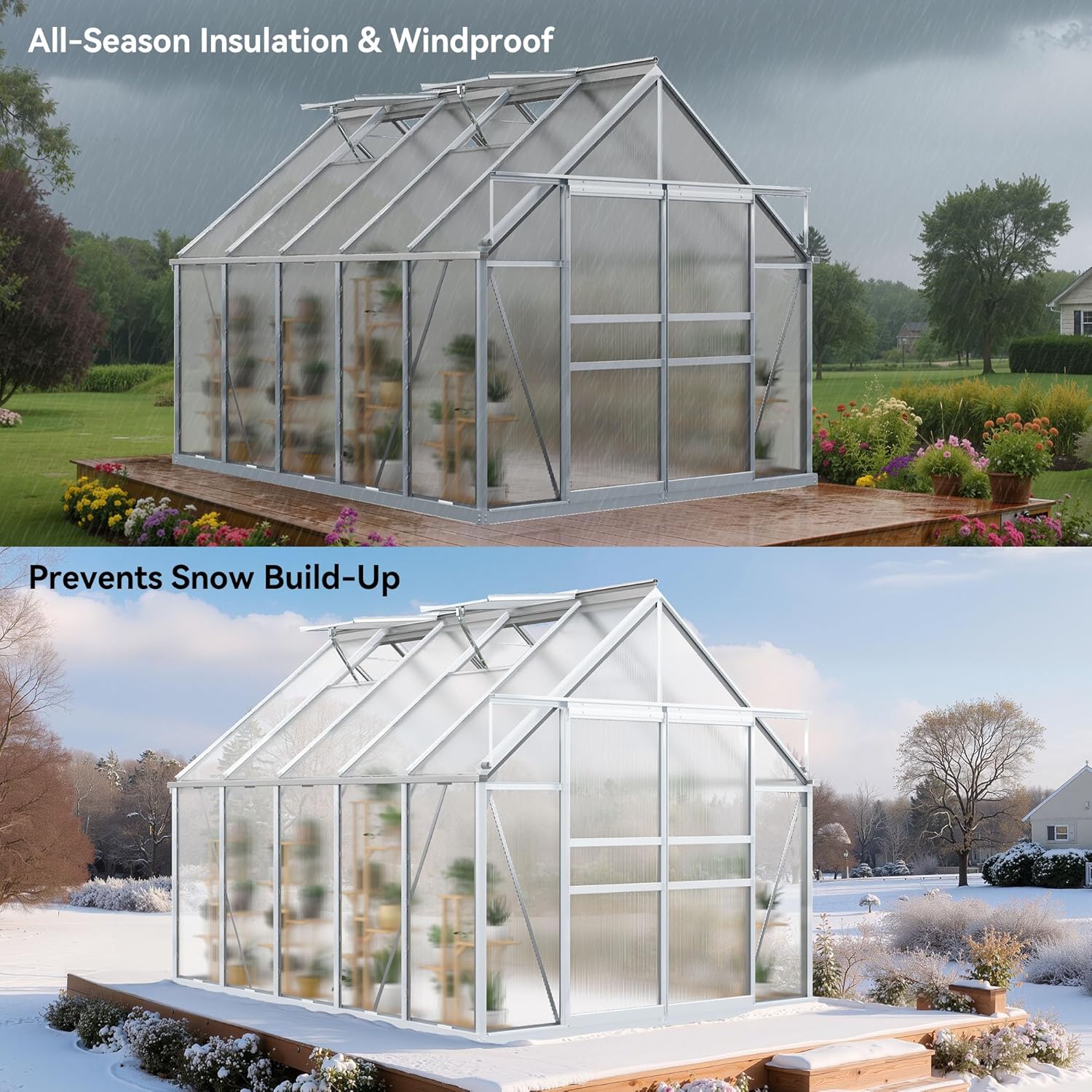 - ALL SEASON GREENHOUSE: Top tilt angle design of the polycarbonate aluminum greenhouse helps to achieve effective wind resistance and drainage capacity; This beautiful and convenient product is suitable for gardens, decks, and backyards for year-round plant cultivation and protection