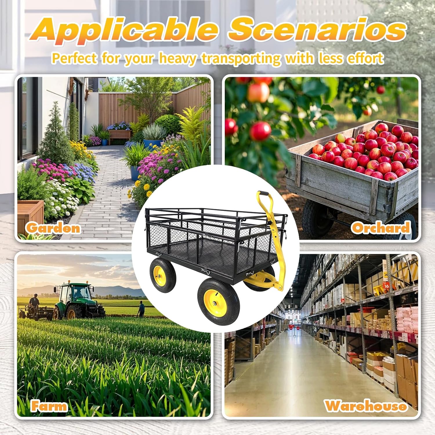 Steel Garden Cart On Wheels, 1400 Lbs Capacity, 2-in-1 Handle and 16 in Tires, Heavy Duty Wagon Cart with Removable Mesh Sides to Convert Into Flatbed